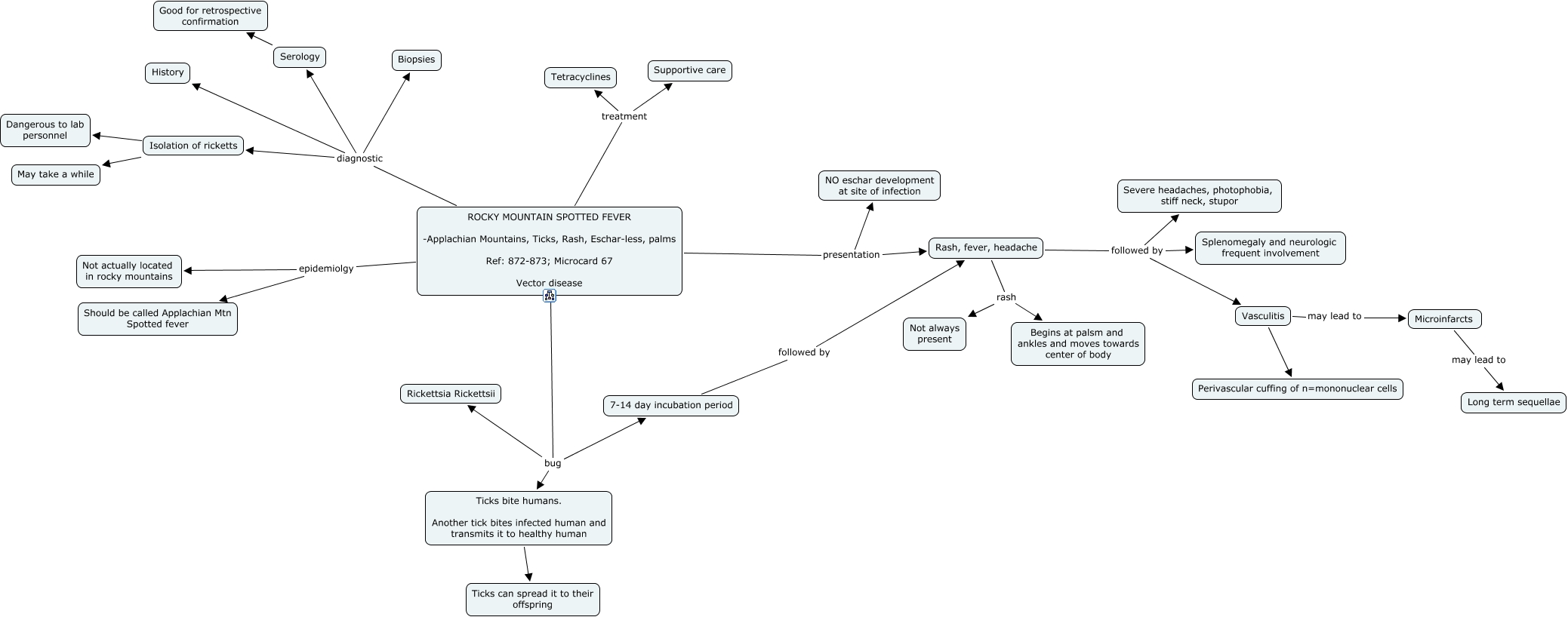 This Concept Map, created with IHMC CmapTools, has information related to: 04d. Rocky Mountain Spotted Fever, ROCKY MOUNTAIN SPOTTED FEVER -Applachian Mountains, Ticks, Rash, Eschar-less, palms Ref: 872-873; Microcard 67 Vector disease bug Ticks bite humans. Another tick bites infected human and transmits it to healthy human, ROCKY MOUNTAIN SPOTTED FEVER -Applachian Mountains, Ticks, Rash, Eschar-less, palms Ref: 872-873; Microcard 67 Vector disease diagnostic Serology, ROCKY MOUNTAIN SPOTTED FEVER -Applachian Mountains, Ticks, Rash, Eschar-less, palms Ref: 872-873; Microcard 67 Vector disease diagnostic History, Rash, fever, headache followed by Severe headaches, photophobia, stiff neck, stupor, ROCKY MOUNTAIN SPOTTED FEVER -Applachian Mountains, Ticks, Rash, Eschar-less, palms Ref: 872-873; Microcard 67 Vector disease epidemiolgy Should be called Applachian Mtn Spotted fever, ROCKY MOUNTAIN SPOTTED FEVER -Applachian Mountains, Ticks, Rash, Eschar-less, palms Ref: 872-873; Microcard 67 Vector disease treatment Supportive care, Rash, fever, headache rash Begins at palsm and ankles and moves towards center of body, ROCKY MOUNTAIN SPOTTED FEVER -Applachian Mountains, Ticks, Rash, Eschar-less, palms Ref: 872-873; Microcard 67 Vector disease epidemiolgy Not actually located in rocky mountains, ROCKY MOUNTAIN SPOTTED FEVER -Applachian Mountains, Ticks, Rash, Eschar-less, palms Ref: 872-873; Microcard 67 Vector disease diagnostic Biopsies, ROCKY MOUNTAIN SPOTTED FEVER -Applachian Mountains, Ticks, Rash, Eschar-less, palms Ref: 872-873; Microcard 67 Vector disease bug Rickettsia Rickettsii, Rash, fever, headache rash Not always present, Rash, fever, headache followed by Vasculitis, ROCKY MOUNTAIN SPOTTED FEVER -Applachian Mountains, Ticks, Rash, Eschar-less, palms Ref: 872-873; Microcard 67 Vector disease diagnostic Isolation of ricketts, Microinfarcts may lead to Long term sequellae, ROCKY MOUNTAIN SPOTTED FEVER -Applachian Mountains, Ticks, Rash, Eschar-less, palms Ref: 872-873; Microcard 67 Vector disease bug 7-14 day incubation period, ROCKY MOUNTAIN SPOTTED FEVER -Applachian Mountains, Ticks, Rash, Eschar-less, palms Ref: 872-873; Microcard 67 Vector disease treatment Tetracyclines, Rash, fever, headache followed by Splenomegaly and neurologic frequent involvement, Ticks bite humans. Another tick bites infected human and transmits it to healthy human Ticks can spread it to their offspring, Isolation of ricketts Dangerous to lab personnel, 7-14 day incubation period followed by Rash, fever, headache