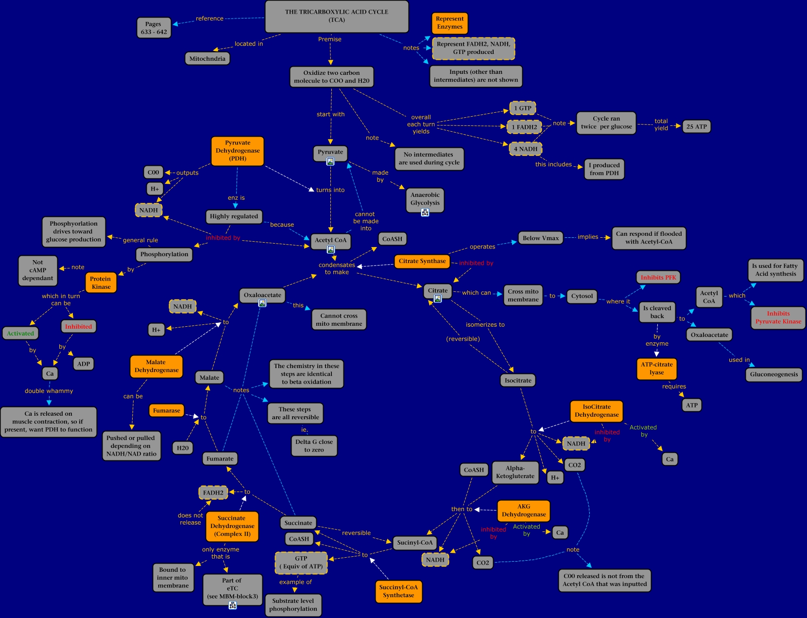 This Concept Map, created with IHMC CmapTools, has information related to: 15. TCA Cyle, Sucinyl-CoA to CoASH, Oxaloacetate notes The chemistry in these steps are identical to beta oxidation, Succinate reversible Sucinyl-CoA, Succinate notes These steps are all reversible, Pyruvate Dehydrogenase (PDH) outputs H+, 4 NADH note Cycle ran twice per glucose, Alpha- Ketogluterate then to NADH, GTP ( Equiv of ATP) example of Substrate level phosphorylation, Succinate Dehydrogenase (Complex II) only enzyme that is Bound to inner mito membrane, Succinate Dehydrogenase (Complex II) does not release FADH2, AKG Dehydrogenase then to NADH, Fumarate to Malate, Is cleaved back by enzyme ATP-citrate lyase, THE TRICARBOXYLIC ACID CYCLE (TCA) notes Inputs (other than intermediates) are not shown, Cytosol where it Inhibits PFK, Malate Dehydrogenase to H+, AKG Dehydrogenase then to CO2, Cytosol where it Is cleaved back, Malate to Oxaloacetate, Fumarate notes These steps are all reversible