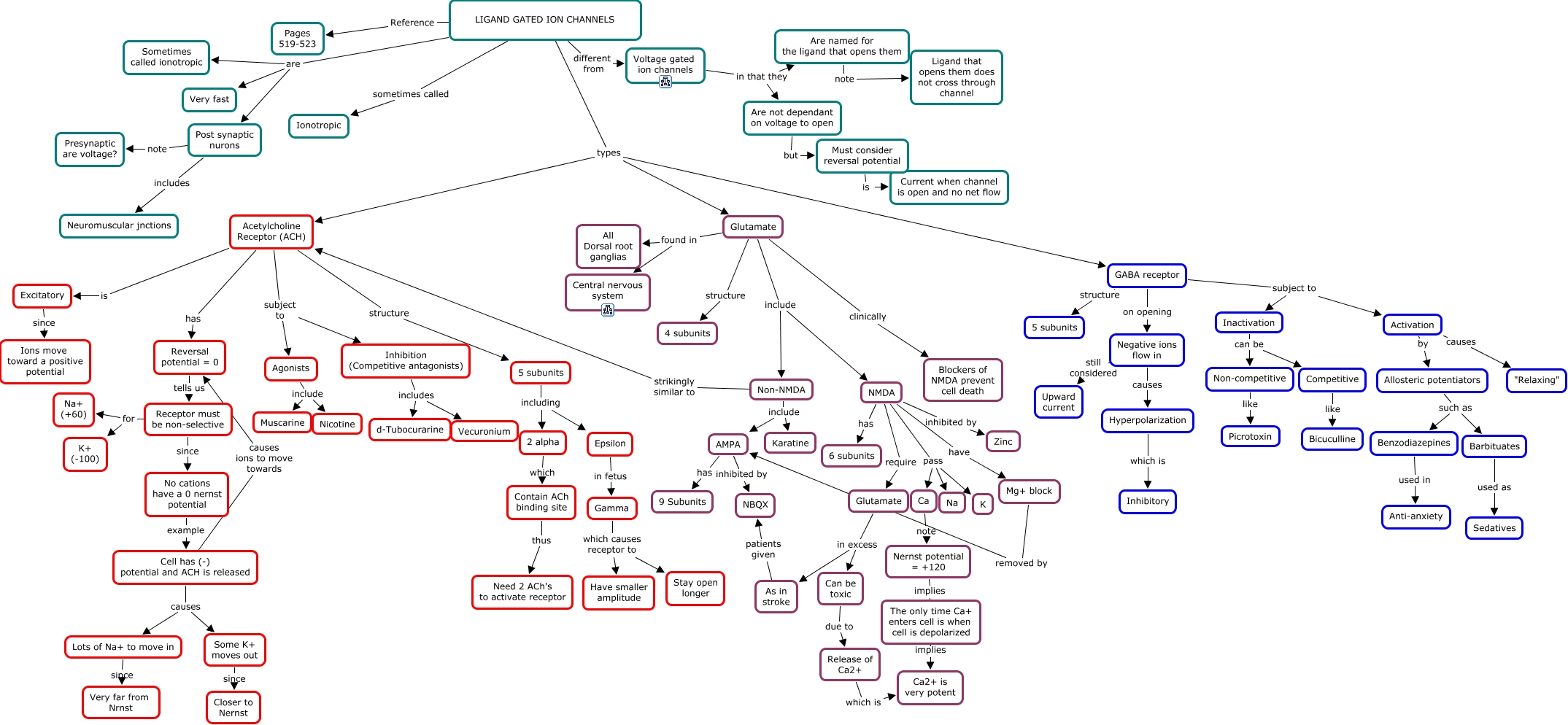 This Concept Map, created with IHMC CmapTools, has information related to: 15. Ligand Gated Ion Channels, 5 subunits including Epsilon, LIGAND GATED ION CHANNELS types Acetylcholine Receptor (ACH), Glutamate structure 4 subunits, Inactivation can be Non-competitive, Non-NMDA include Karatine, LIGAND GATED ION CHANNELS types GABA receptor, Mg+ block removed by AMPA, Voltage gated ion channels in that they Are not dependant on voltage to open, LIGAND GATED ION CHANNELS Reference Pages 519-523, AMPA has 9 Subunits, Receptor must be non-selective for K+ (-100), Glutamate found in All Dorsal root ganglias, LIGAND GATED ION CHANNELS are Very fast, Post synaptic nurons includes Neuromuscular jnctions, Hyperpolarization which is Inhibitory, NMDA pass Ca, Receptor must be non-selective for Na+ (+60), Excitatory since Ions move toward a positive potential, LIGAND GATED ION CHANNELS different from Voltage gated ion channels, Allosteric potentiators such as Benzodiazepines