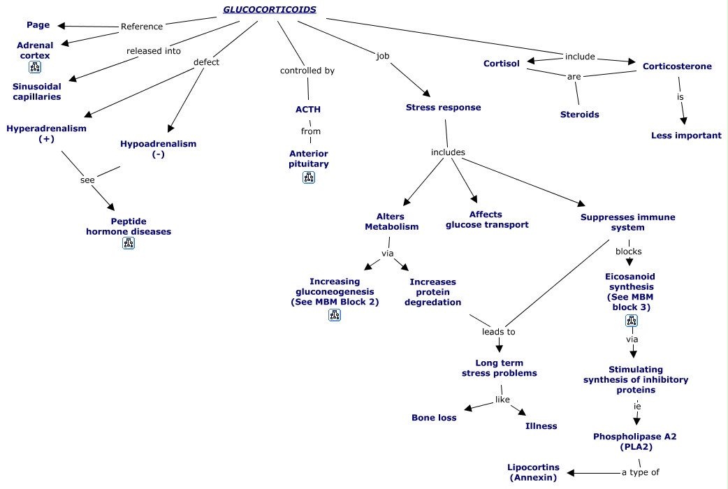 This Concept Map, created with IHMC CmapTools, has information related to: 08. Glucocorticoids, Corticosterone is Less important, GLUCOCORTICOIDS released into Sinusoidal capillaries, Long term stress problems like Illness, GLUCOCORTICOIDS defect Hypoadrenalism (-), Alters Metabolism via Increasing gluconeogenesis (See MBM Block 2), Stress response includes Suppresses immune system, Suppresses immune system blocks Eicosanoid synthesis (See MBM block 3), GLUCOCORTICOIDS defect Hyperadrenalism (+), Stimulating synthesis of inhibitory proteins ie Phospholipase A2 (PLA2), Suppresses immune system leads to Long term stress problems, Alters Metabolism via Increases protein degredation, Hyperadrenalism (+) see Peptide hormone diseases, Phospholipase A2 (PLA2) a type of Lipocortins (Annexin), Increases protein degredation leads to Long term stress problems, GLUCOCORTICOIDS Reference Adrenal cortex, GLUCOCORTICOIDS include Corticosterone, Cortisol are Steroids, Stress response includes Alters Metabolism, Hypoadrenalism (-) see Peptide hormone diseases, GLUCOCORTICOIDS include Cortisol