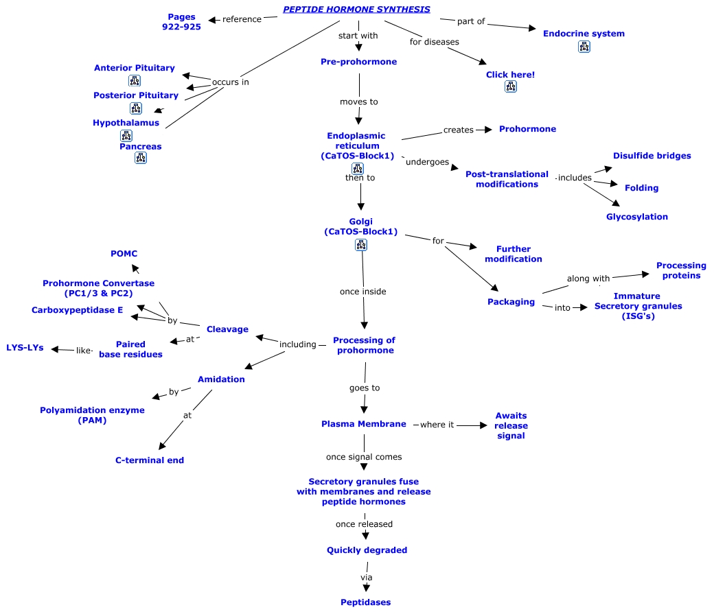 This Concept Map, created with IHMC CmapTools, has information related to: 11. Peptide Hormone Synthesis, Paired base residues like LYS-LYs, Endoplasmic reticulum (CaTOS-Block1) undergoes Post-translational modifications, Cleavage by POMC, Cleavage at Paired base residues, PEPTIDE HORMONE SYNTHESIS for diseases Click here!, Quickly degraded via Peptidases, Golgi (CaTOS-Block1) for Further modification, Processing of prohormone including Amidation, Golgi (CaTOS-Block1) once inside Processing of prohormone, PEPTIDE HORMONE SYNTHESIS occurs in Pancreas, Endoplasmic reticulum (CaTOS-Block1) then to Golgi (CaTOS-Block1), Secretory granules fuse with membranes and release peptide hormones once released Quickly degraded, PEPTIDE HORMONE SYNTHESIS occurs in Posterior Pituitary, Packaging into Immature Secretory granules (ISG's), PEPTIDE HORMONE SYNTHESIS part of Endocrine system, PEPTIDE HORMONE SYNTHESIS occurs in Anterior Pituitary, Amidation at C-terminal end, PEPTIDE HORMONE SYNTHESIS reference Pages 922-925, Post-translational modifications includes Folding, Processing of prohormone including Cleavage