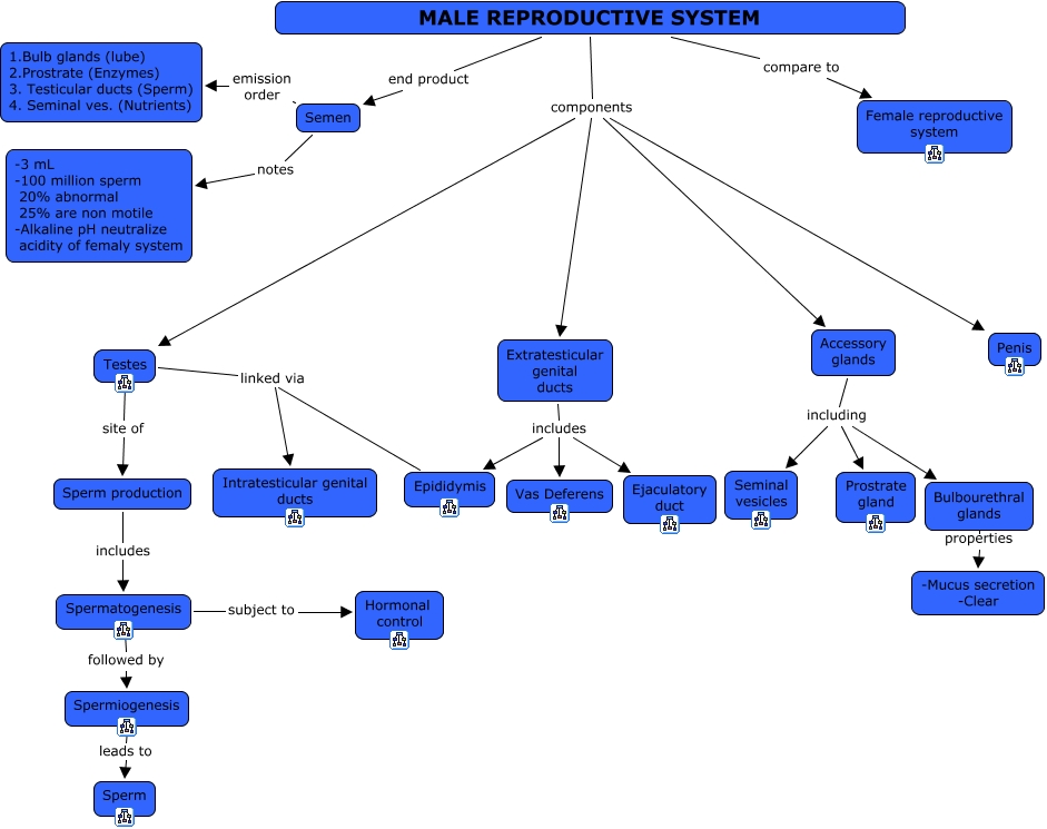 This Concept Map, created with IHMC CmapTools, has information related to: 31. Male reproductive system, Spermiogenesis leads to Sperm, Testes site of Sperm production, Accessory glands including Prostrate gland, MALE REPRODUCTIVE SYSTEM components Testes, Spermatogenesis followed by Spermiogenesis, Extratesticular genital ducts includes Epididymis, MALE REPRODUCTIVE SYSTEM components Extratesticular genital ducts, MALE REPRODUCTIVE SYSTEM end product Semen, Testes linked via Intratesticular genital ducts, Semen emission order 1.Bulb glands (lube) 2.Prostrate (Enzymes) 3. Testicular ducts (Sperm) 4. Seminal ves. (Nutrients), Spermatogenesis subject to Hormonal control, MALE REPRODUCTIVE SYSTEM compare to Female reproductive system, Epididymis linked via Intratesticular genital ducts, Bulbourethral glands properties -Mucus secretion -Clear, Accessory glands including Seminal vesicles, Accessory glands including Bulbourethral glands, Extratesticular genital ducts includes Vas Deferens, Semen notes -3 mL -100 million sperm 20% abnormal 25% are non motile -Alkaline pH neutralize acidity of femaly system, MALE REPRODUCTIVE SYSTEM components Penis, MALE REPRODUCTIVE SYSTEM components Accessory glands
