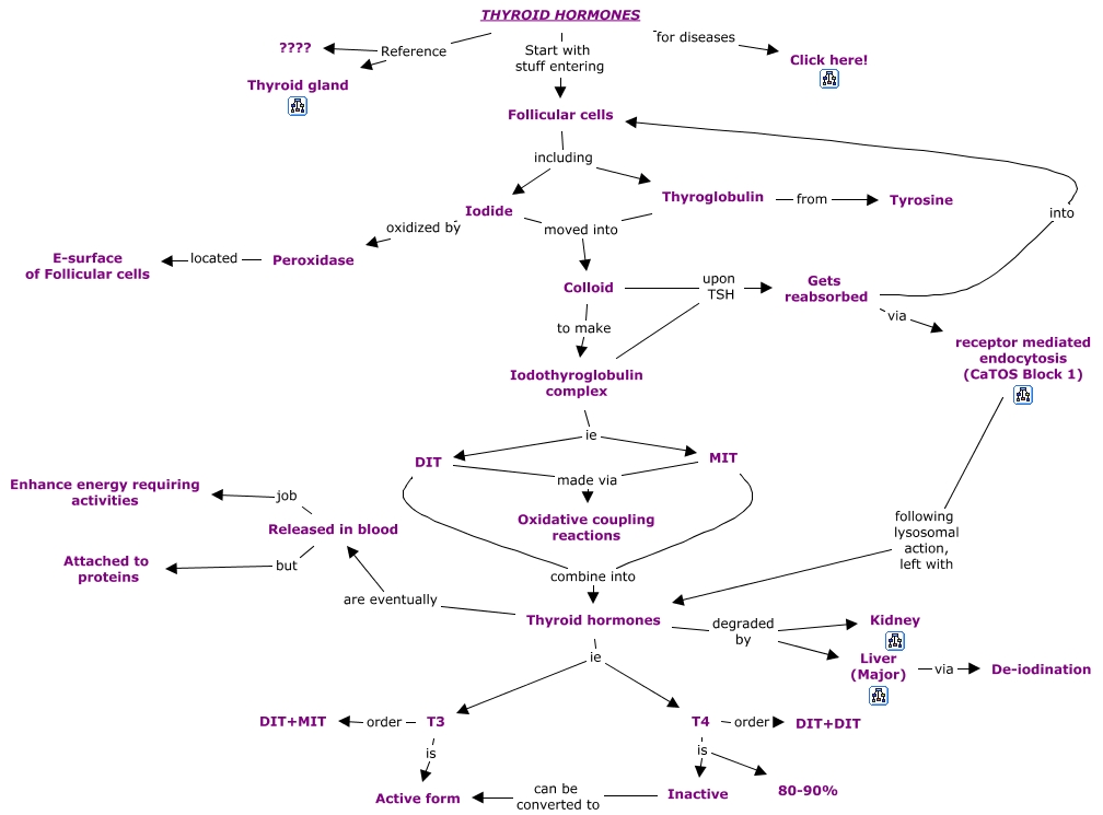This Concept Map, created with IHMC CmapTools, has information related to: 04a. Thyroid Hormones, Iodothyroglobulin complex upon TSH Gets reabsorbed, Thyroid hormones ie T4, T3 is Active form, THYROID HORMONES Reference ????, Gets reabsorbed into Follicular cells, MIT made via Oxidative coupling reactions, DIT made via Oxidative coupling reactions, Released in blood job Enhance energy requiring activities, Thyroglobulin moved into Colloid, Follicular cells including Thyroglobulin, Follicular cells including Iodide, Thyroid hormones ie T3, Liver (Major) via De-iodination, T3 order DIT+MIT, Thyroid hormones are eventually Released in blood, THYROID HORMONES for diseases Click here!, MIT combine into Thyroid hormones, Thyroid hormones degraded by Kidney, T4 is Inactive, Gets reabsorbed via receptor mediated endocytosis (CaTOS Block 1)
