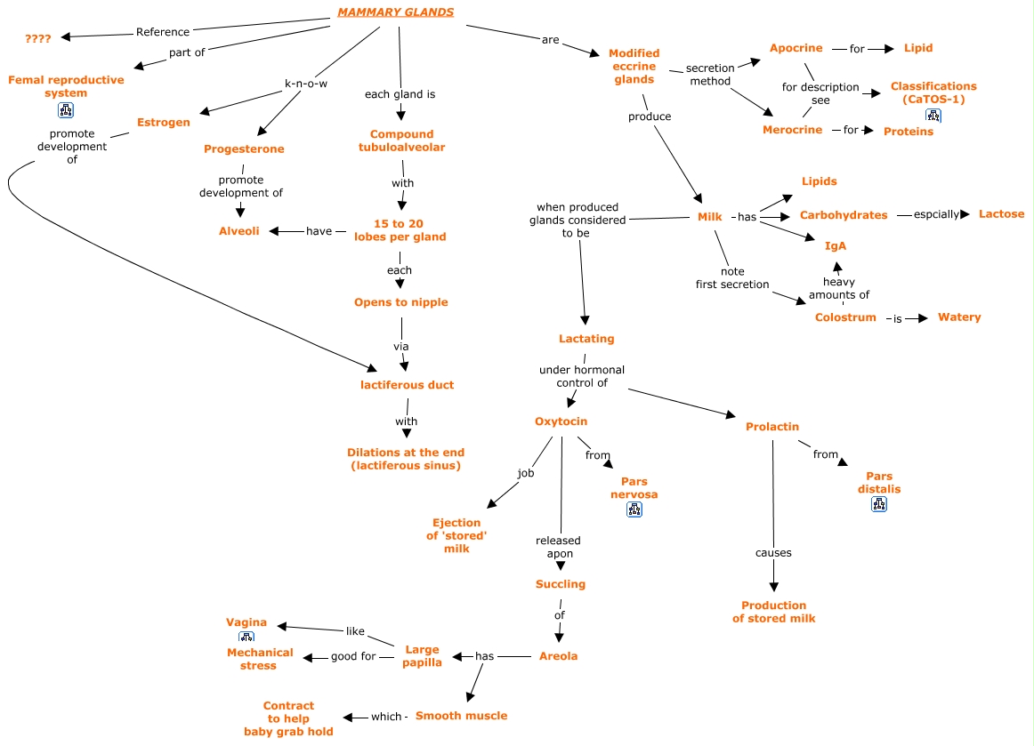 This Concept Map, created with IHMC CmapTools, has information related to: 30g. Mammary Glands, Apocrine for description see Classifications (CaTOS-1), Oxytocin released apon Succling, Milk has IgA, Merocrine for description see Classifications (CaTOS-1), Prolactin from Pars distalis, Milk has Carbohydrates, Large papilla like Vagina, Progesterone promote development of Alveoli, Opens to nipple via lactiferous duct, Carbohydrates espcially Lactose, Lactating under hormonal control of Oxytocin, Estrogen promote development of lactiferous duct, 15 to 20 lobes per gland have Alveoli, Prolactin causes Production of stored milk, Milk when produced glands considered to be Lactating, Oxytocin from Pars nervosa, Areola has Smooth muscle, Modified eccrine glands secretion method Apocrine, Large papilla good for Mechanical stress, Succling of Areola