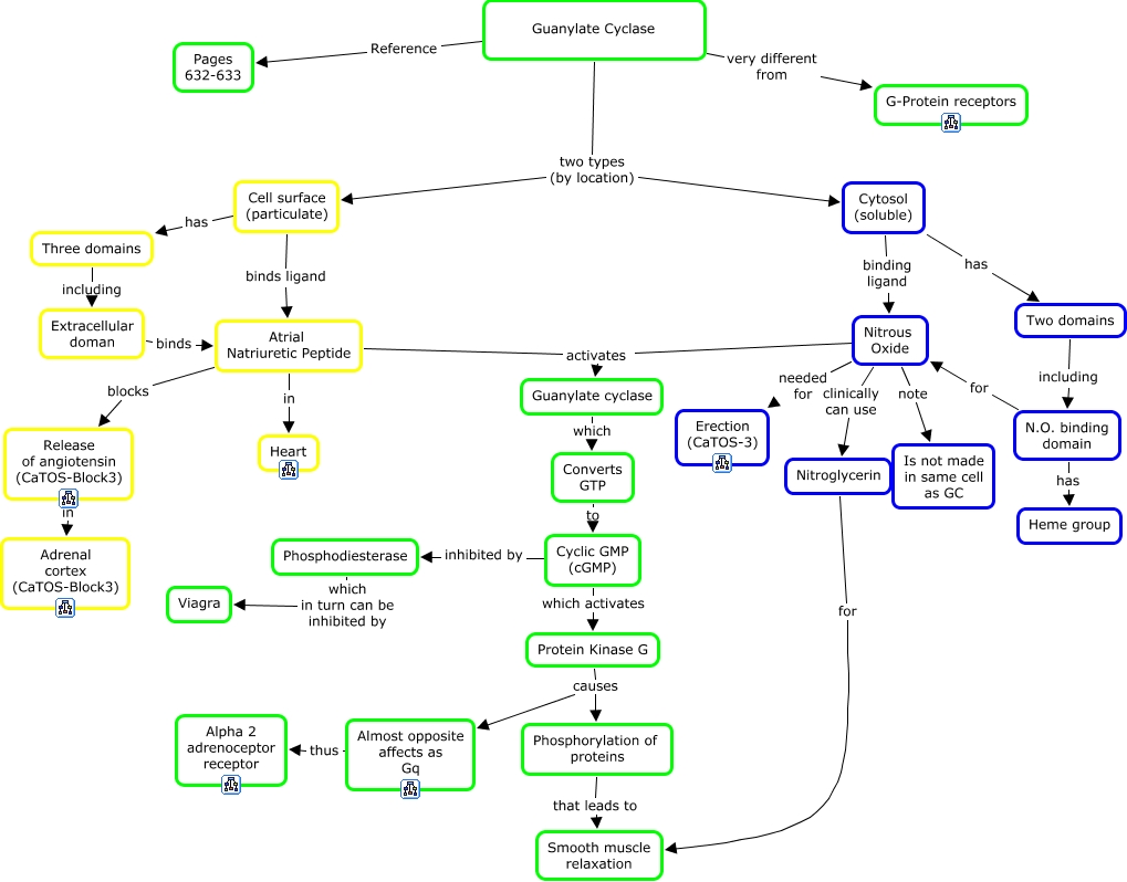 This Concept Map, created with IHMC CmapTools, has information related to: 28. Guanylate Cyclase, Nitrous Oxide needed for Erection (CaTOS-3), Nitrous Oxide activates Guanylate cyclase, Cyclic GMP (cGMP) inhibited by Phosphodiesterase, Guanylate cyclase which Converts GTP, N.O. binding domain for Nitrous Oxide, Three domains including Extracellular doman, Nitrous Oxide clinically can use Nitroglycerin, Cell surface (particulate) binds ligand Atrial Natriuretic Peptide, Atrial Natriuretic Peptide blocks Release of angiotensin (CaTOS-Block3), Phosphodiesterase which in turn can be inhibited by Viagra, Nitrous Oxide note Is not made in same cell as GC, Nitroglycerin for Smooth muscle relaxation, Atrial Natriuretic Peptide in Heart, Cytosol (soluble) has Two domains, Guanylate Cyclase Reference Pages 632-633, Extracellular doman binds Atrial Natriuretic Peptide, Guanylate Cyclase two types (by location) Cell surface (particulate), Cytosol (soluble) binding ligand Nitrous Oxide, Protein Kinase G causes Phosphorylation of proteins, N.O. binding domain has Heme group