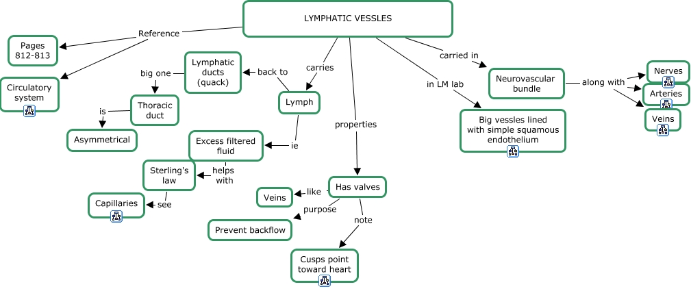 This Concept Map, created with IHMC CmapTools, has information related to: 35. Lymphatic Vessles, LYMPHATIC VESSLES carries Lymph, LYMPHATIC VESSLES Reference Pages 812-813, Thoracic duct is Asymmetrical, Has valves purpose Prevent backflow, Has valves like Veins, Lymph back to Lymphatic ducts (quack), Neurovascular bundle along with Nerves, Sterling's law see Capillaries, Neurovascular bundle along with Arteries, Has valves note Cusps point toward heart, Lymphatic ducts (quack) big one Thoracic duct, Lymph ie Excess filtered fluid, LYMPHATIC VESSLES in LM lab Big vessles lined with simple squamous endothelium, LYMPHATIC VESSLES Reference Circulatory system, Excess filtered fluid helps with Sterling's law, LYMPHATIC VESSLES carried in Neurovascular bundle, Neurovascular bundle along with Veins, LYMPHATIC VESSLES properties Has valves