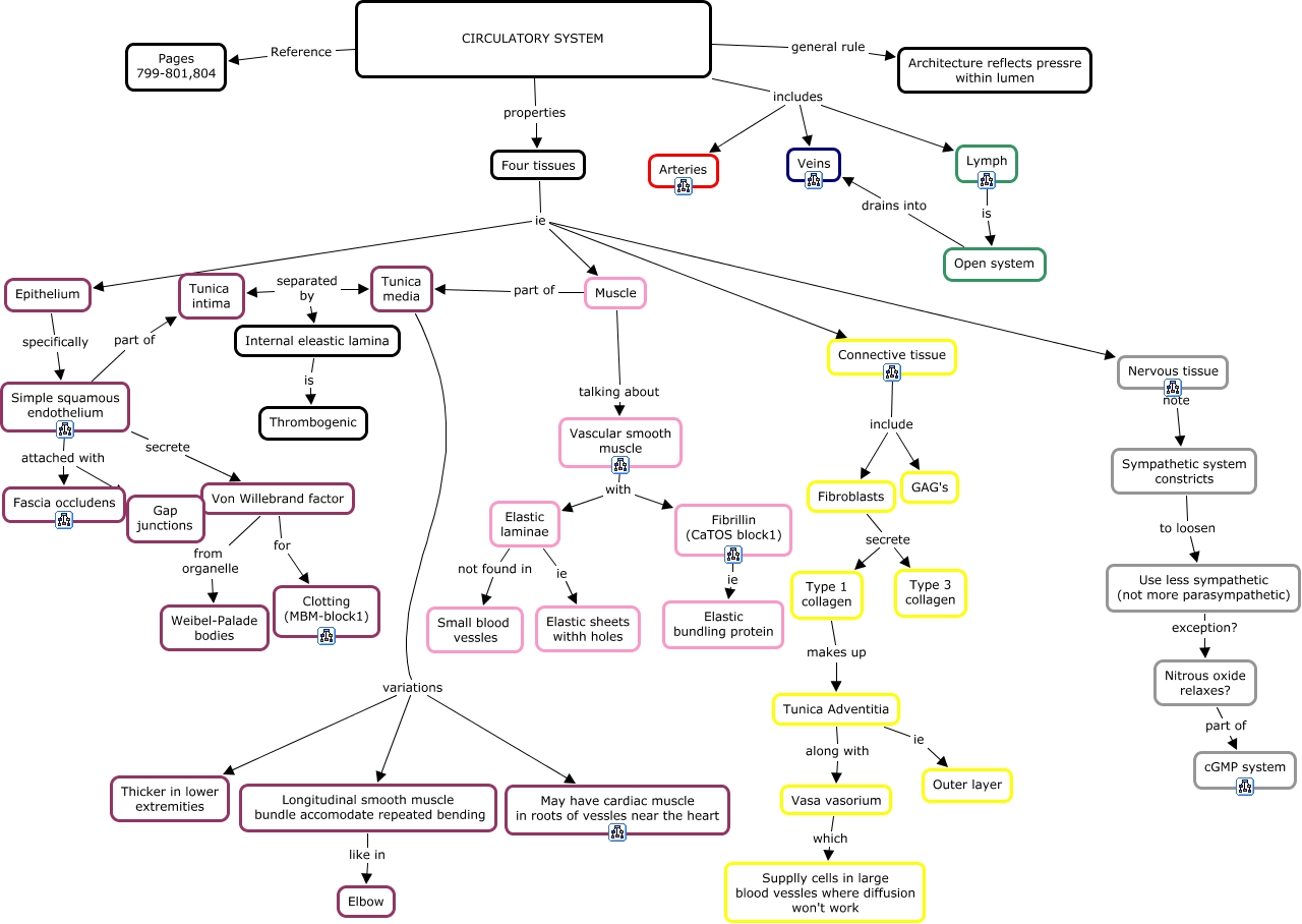This Concept Map, created with IHMC CmapTools, has information related to: 31. Circulatory System, Use less sympathetic (not more parasympathetic) exception? Nitrous oxide relaxes?, Simple squamous endothelium attached with Fascia occludens, Open system drains into Veins, Type 1 collagen makes up Tunica Adventitia, Vasa vasorium which Supplly cells in large blood vessles where diffusion won't work, Fibroblasts secrete Type 1 collagen, Connective tissue include Fibroblasts, Simple squamous endothelium part of Tunica intima, Nitrous oxide relaxes? part of cGMP system, Von Willebrand factor from organelle Weibel-Palade bodies, Simple squamous endothelium secrete Von Willebrand factor, CIRCULATORY SYSTEM properties Four tissues, Tunica Adventitia ie Outer layer, Tunica Adventitia along with Vasa vasorium, Four tissues ie Muscle, Vascular smooth muscle with Elastic laminae, Connective tissue include GAG's, Tunica media variations May have cardiac muscle in roots of vessles near the heart, Elastic laminae ie Elastic sheets withh holes, Fibroblasts secrete Type 3 collagen
