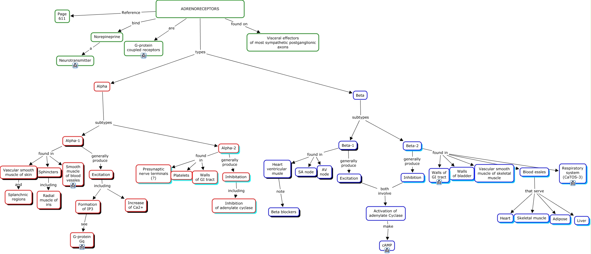 This Concept Map, created with IHMC CmapTools, has information related to: 26. Adrenoreceptors, Formation of IP3 see G-protein Gq, Blood essles that serve Liver, Beta-1 generally produce Excitation, ADRENORECEPTORS types Alpha, ADRENORECEPTORS found on Visceral effectors of most sympathetic postganglionic axons, Blood essles that serve Heart, Alpha-1 found in Smooth muscle of blood vessles, ADRENORECEPTORS Reference Page 611, Excitation including Formation of IP3, Inhibitation including Inhibition of adenylate cyclase, Excitation both involve Activation of adenylate Cyclase, Beta-1 found in Heart ventricular musle, Alpha subtypes Alpha-1, ADRENORECEPTORS types Beta, Beta-2 found in Walls of GI tract, Alpha-2 found in Walls of GI tract, Alpha-1 found in Vascular smooth muscle of skin, Inhibition both involve Activation of adenylate Cyclase, Alpha-2 generally produce Inhibitation, Beta-1 found in AV node