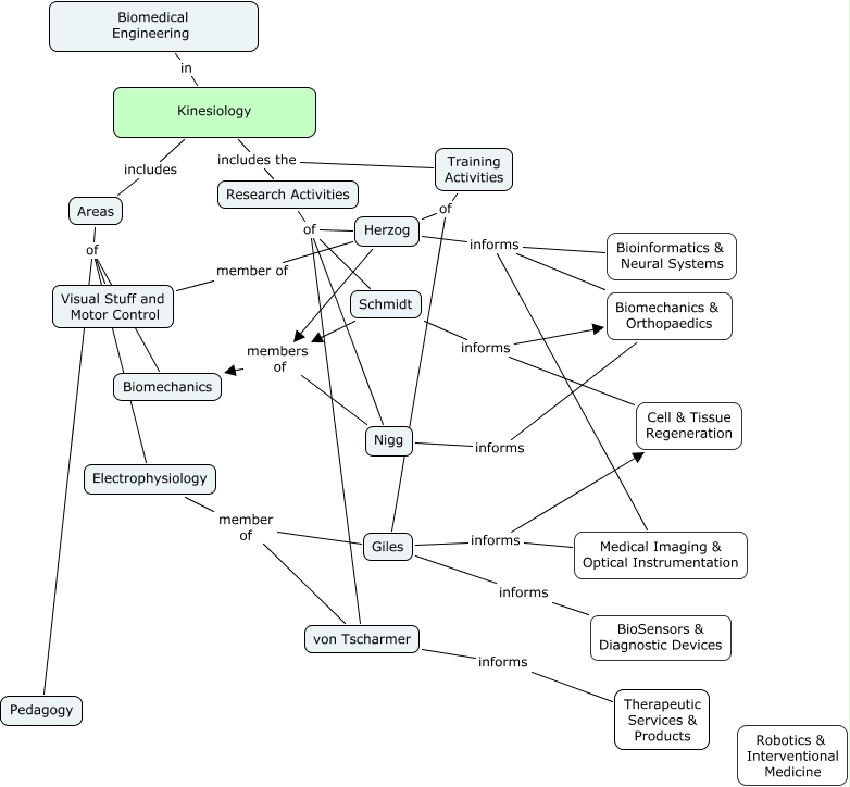 This Concept Map, created with IHMC CmapTools, has information related to: Kines, Herzog members of Nigg, Herzog informs Biomechanics & Orthopaedics, von Tscharmer informs Therapeutic Services & Products, Training Activities of Herzog, Areas of Pedagogy, Biomedical Engineering in Kinesiology, Herzog informs Medical Imaging & Optical Instrumentation, Schmidt members of Biomechanics, Areas of Electrophysiology, Research Activities of Nigg, Schmidt informs Biomechanics & Orthopaedics, Areas of Visual Stuff and Motor Control, Giles informs Cell & Tissue Regeneration, Schmidt members of Nigg, Herzog member of Visual Stuff and Motor Control, Electrophysiology member of Giles, Kinesiology includes the Research Activities, Research Activities of Herzog, Herzog members of Biomechanics, Herzog informs Bioinformatics & Neural Systems