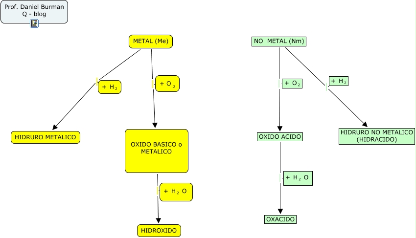 </mtext> <mmultiscripts> <mtext> </mtext> <mtext> </mtext> <none/> </mmultiscripts> </mrow> </math>, NO METAL (Nm) <math xmlns="http://www.w3.org/1998/Math/MathML"> <mrow> <mtext> + </mtext> <mmultiscripts> <mtext> H </mtext> <mtext> 2 </mtext> <none/> </mmultiscripts> </mrow> </math>, METAL (Me) <math xmlns="http://www.w3.org/1998/Math/MathML"> <mrow> <mtext> + O </mtext> <mmultiscripts> <mtext> </mtext> <mtext> 2 </mtext> <none/> </mmultiscripts> </mrow> </math>, NO METAL (Nm) OXIDO ACIDO, NO METAL (Nm) <math xmlns="http://www.w3.org/1998/Math/MathML"> <mrow> <mtext> + </mtext> <mmultiscripts> <mtext> O </mtext> <mtext> 2 </mtext> <none/> </mmultiscripts> </mrow> </math>, METAL (Me) <math xmlns="http://www.w3.org/1998/Math/MathML"> <mrow> <mtext> + </mtext> <mmultiscripts> <mtext> H </mtext> <mtext> 2 </mtext> <none/> </mmultiscripts> </mrow> </math>, NO METAL (Nm) HIDRURO NO METALICO (HIDRACIDO)