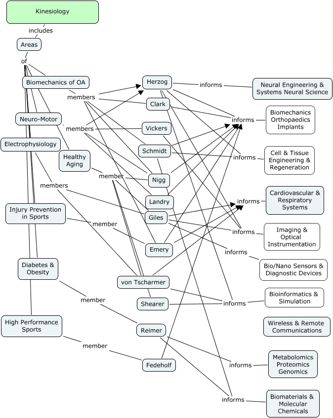 This Concept Map, created with IHMC CmapTools, has information related to: _Kines2, Healthy Aging of Biomechanics of OA, Areas of Neuro-Motor, Giles informs Imaging & Optical Instrumentation, Healthy Aging member Nigg, von Tscharmer members Giles, Healthy Aging of High Performance Sports, Healthy Aging of Injury Prevention in Sports, Shearer member von Tscharmer, Reimer informs Metabolomics Proteomics Genomics, Healthy Aging member Giles, Clark informs Biomechanics Orthopaedics Implants, Schmidt members Emery, Vickers members Herzog, Kinesiology includes Areas, Healthy Aging of Electrophysiology, Areas of Electrophysiology, Landry members Herzog, von Tscharmer informs Bioinformatics & Simulation, Diabetes & Obesity of High Performance Sports, Schmidt members Herzog