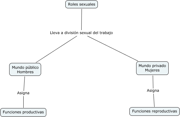 Este mapa conceptual tiene información relacionada a: Roles sociales, Mundo privado Mujeres Asigna Funciones reproductivas, Roles sexuales Lleva a división sexual del trabajo Mundo público Hombres, Roles sexuales Lleva a división sexual del trabajo Mundo privado Mujeres, Mundo público Hombres Asigna Funciones productivas