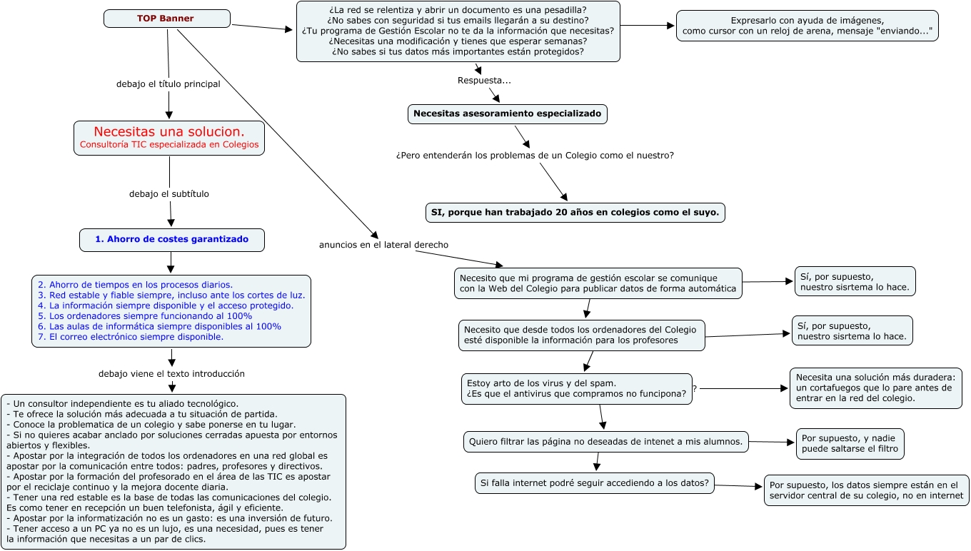 Este Cmap, tiene información relacionada con: Portada web Tusolucion.org, Quiero filtrar las página no deseadas de intenet a mis alumnos. ???? Si falla internet podré seguir accediendo a los datos?, Necesito que desde todos los ordenadores del Colegio esté disponible la información para los profesores ???? Estoy arto de los virus y del spam. ¿Es que el antivirus que compramos no funcipona?, Si falla internet podré seguir accediendo a los datos? ???? Por supuesto, los datos siempre están en el servidor central de su colegio, no en internet, Necesito que mi programa de gestión escolar se comunique con la Web del Colegio para publicar datos de forma automática ???? Sí, por supuesto, nuestro sisrtema lo hace., TOP Banner debajo el título principal Necesitas una solucion. Consultoría TIC especializada en Colegios, TOP Banner anuncios en el lateral derecho Necesito que mi programa de gestión escolar se comunique con la Web del Colegio para publicar datos de forma automática, Necesito que desde todos los ordenadores del Colegio esté disponible la información para los profesores ???? Sí, por supuesto, nuestro sisrtema lo hace., Necesitas asesoramiento especializado ¿Pero entenderán los problemas de un Colegio como el nuestro? SI, porque han trabajado 20 años en colegios como el suyo., Necesito que mi programa de gestión escolar se comunique con la Web del Colegio para publicar datos de forma automática ???? Necesito que desde todos los ordenadores del Colegio esté disponible la información para los profesores, 1. Ahorro de costes garantizado ???? 2. Ahorro de tiempos en los procesos diarios. 3. Red estable y fiable siempre, incluso ante los cortes de luz. 4. La información siempre disponible y el acceso protegido. 5. Los ordenadores siempre funcionando al 100% 6. Las aulas de informática siempre disponibles al 100% 7. El correo electrónico siempre disponible., Estoy arto de los virus y del spam. ¿Es que el antivirus que compramos no funcipona? ???? Quiero filtrar las página no deseadas de intenet a mis alumnos., TOP Banner ???? ¿La red se relentiza y abrir un documento es una pesadilla? ¿No sabes con seguridad si tus emails llegarán a su destino? ¿Tu programa de Gestión Escolar no te da la información que necesitas? ¿Necesitas una modificación y tienes que esperar semanas? ¿No sabes si tus datos más importantes están protegidos?, Estoy arto de los virus y del spam. ¿Es que el antivirus que compramos no funcipona? ???? Necesita una solución más duradera: un cortafuegos que lo pare antes de entrar en la red del colegio., ¿La red se relentiza y abrir un documento es una pesadilla? ¿No sabes con seguridad si tus emails llegarán a su destino? ¿Tu programa de Gestión Escolar no te da la información que necesitas? ¿Necesitas una modificación y tienes que esperar semanas? ¿No sabes si tus datos más importantes están protegidos? Respuesta... Necesitas asesoramiento especializado, Quiero filtrar las página no deseadas de intenet a mis alumnos. ???? Por supuesto, y nadie puede saltarse el filtro, 2. Ahorro de tiempos en los procesos diarios. 3. Red estable y fiable siempre, incluso ante los cortes de luz. 4. La información siempre disponible y el acceso protegido. 5. Los ordenadores siempre funcionando al 100% 6. Las aulas de informática siempre disponibles al 100% 7. El correo electrónico siempre disponible. debajo viene el texto introducción - Un consultor independiente es tu aliado tecnológico. - Te ofrece la solución más adecuada a tu situación de partida. - Conoce la problematica de un colegio y sabe ponerse en tu lugar. - Si no quieres acabar anclado por soluciones cerradas apuesta por entornos abiertos y flexibles. - Apostar por la integración de todos los ordenadores en una red global es apostar por la comunicación entre todos: padres, profesores y directivos. - Apostar por la formación del profesorado en el área de las TIC es apostar por el reciclaje continuo y la mejora docente diaria. - Tener una red estable es la base de todas las comunicaciones del colegio. Es como tener en recepción un buen telefonista, ágil y eficiente. - Apostar por la informatización no es un gasto: es una inversión de futuro. - Tener acceso a un PC ya no es un lujo, es una necesidad, pues es tener la información que necesitas a un par de clics., ¿La red se relentiza y abrir un documento es una pesadilla? ¿No sabes con seguridad si tus emails llegarán a su destino? ¿Tu programa de Gestión Escolar no te da la información que necesitas? ¿Necesitas una modificación y tienes que esperar semanas? ¿No sabes si tus datos más importantes están protegidos? ???? Expresarlo con ayuda de imágenes, como cursor con un reloj de arena, mensaje "enviando...", Necesitas una solucion. Consultoría TIC especializada en Colegios debajo el subtítulo 1. Ahorro de costes garantizado