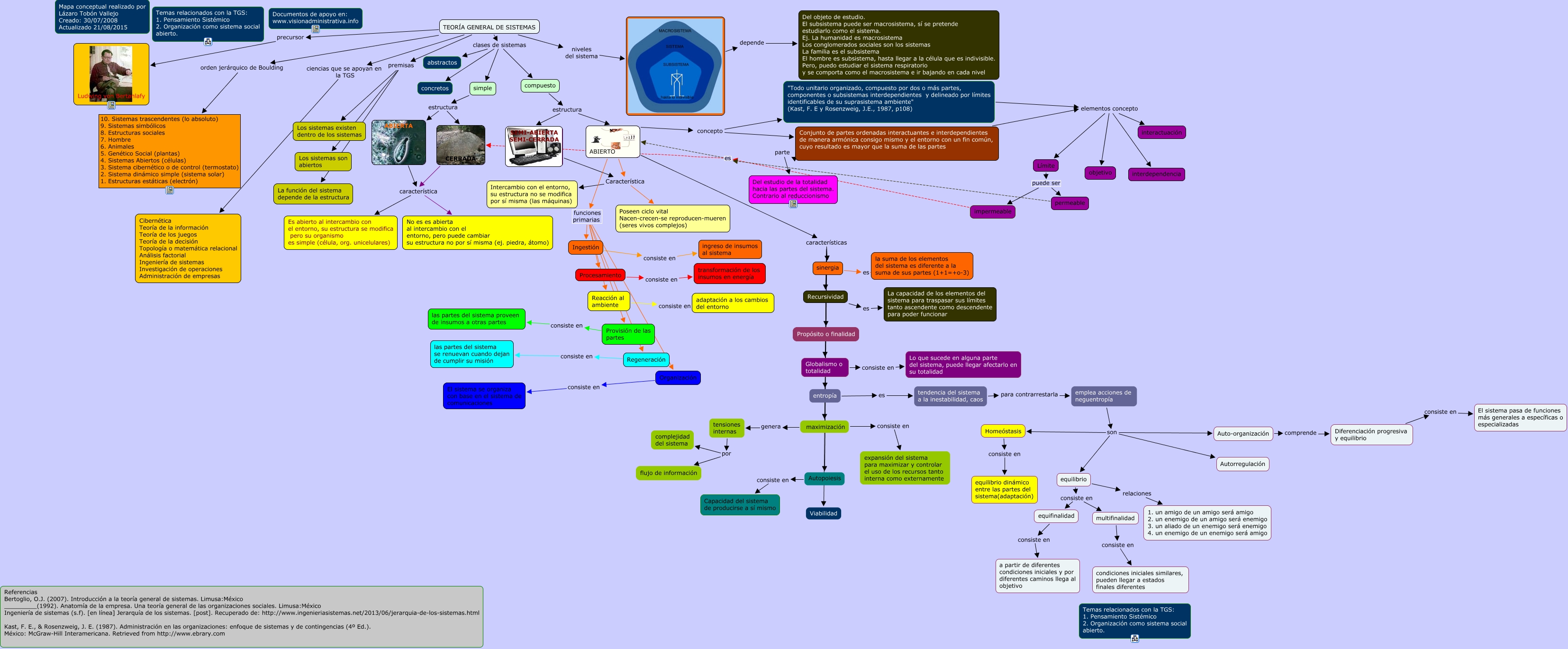 Este Cmap, tiene información relacionada con: TGS, Organización consiste en El sistema se organiza con base en el sistema de comunicaciones, "Todo unitario organizado, compuesto por dos o más partes, componentes o subsistemas interdependientes y delineado por límites identificables de su suprasistema ambiente" (Kast, F. E y Rosenzweig, J.E., 1987, p108) elementos concepto Límite, Recursividad es La capacidad de los elementos del sistema para traspasar sus límites tanto ascendente como descendente para poder funcionar, Procesamiento consiste en transformación de los insumos en energía, emplea acciones de neguentropía son Auto-organización, ABIERTO funciones primarias Procesamiento, Límite puede ser impermeable, Diferenciación progresiva y equilibrio consiste en El sistema pasa de funciones más generales a específicas o especializadas, ABIERTO características sinergia, tendencia del sistema a la inestabilidad, caos para contrarrestarla emplea acciones de neguentropía, equilibrio consiste en multifinalidad, ABIERTO concepto Conjunto de partes ordenadas interactuantes e interdependientes de manera armónica consigo mismo y el entorno con un fin común, cuyo resultado es mayor que la suma de las partes, TEORÍA GENERAL DE SISTEMAS premisas La función del sistema depende de la estructura, ABIERTO Característica Poseen ciclo vital Nacen-crecen-se reproducen-mueren (seres vivos complejos), equifinalidad consiste en a partir de diferentes condiciones iniciales y por diferentes caminos llega al objetivo, TEORÍA GENERAL DE SISTEMAS premisas Los sistemas son abiertos, tensiones internas por flujo de información, maximización consiste en expansión del sistema para maximizar y controlar el uso de los recursos tanto interna como externamente, ABIERTO características Globalismo o totalidad, Auto-organización comprende Diferenciación progresiva y equilibrio