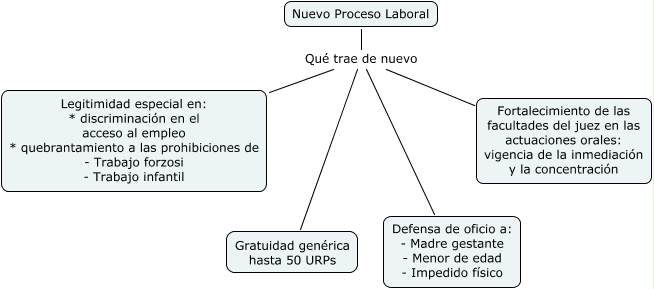 Este Cmap, tiene información relacionada con: NPL 2, Nuevo Proceso Laboral Qué trae de nuevo Legitimidad especial en: * discriminación en el acceso al empleo * quebrantamiento a las prohibiciones de - Trabajo forzosi - Trabajo infantil, Nuevo Proceso Laboral Qué trae de nuevo Gratuidad genérica hasta 50 URPs, Nuevo Proceso Laboral Qué trae de nuevo Defensa de oficio a: - Madre gestante - Menor de edad - Impedido físico, Nuevo Proceso Laboral Qué trae de nuevo Fortalecimiento de las facultades del juez en las actuaciones orales: vigencia de la inmediación y la concentración