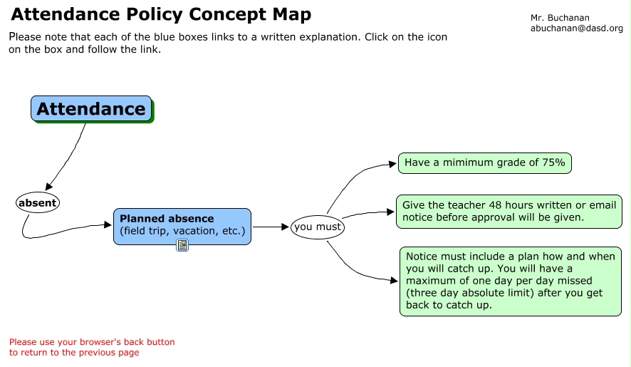 This Concept Map, created with IHMC CmapTools, has information related to: Planned Absence, Planned absence (field trip, vacation, etc.) you must Notice must include a plan how and when you will catch up. You will have a maximum of one day per day missed (three day absolute limit) after you get back to catch up., Attendance absent Planned absence (field trip, vacation, etc.), Planned absence (field trip, vacation, etc.) you must Give the teacher 48 hours written or email notice before approval will be given., Planned absence (field trip, vacation, etc.) you must Have a mimimum grade of 75%