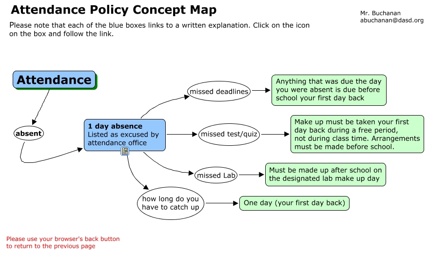 This Concept Map, created with IHMC CmapTools, has information related to: 1 Day Absence, 1 day absence Listed as excused by attendance office missed deadlines Anything that was due the day you were absent is due before school your first day back, 1 day absence Listed as excused by attendance office how long do you have to catch up One day (your first day back), 1 day absence Listed as excused by attendance office missed Lab Must be made up after school on the designated lab make up day, 1 day absence Listed as excused by attendance office missed test/quiz Make up must be taken your first day back during a free period, not during class time. Arrangements must be made before school., Attendance absent 1 day absence Listed as excused by attendance office