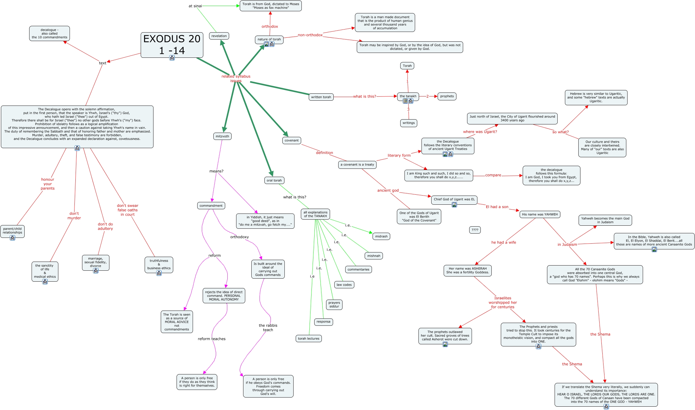 This Concept Map, created with IHMC CmapTools, has information related to: decalogue_cmap, a covenant is a treaty literary form I am King such and such, I did so and so, therefore you shall do x,y,z......, commandment orthodoxy Is built around the ideal of carrying out Gods commands, EXODUS 20 1 -14 related syllabus issues written torah, EXODUS 20 1 -14 related syllabus issues mitzvoth, mitzvoth means? commandment, Just north of Israel, the City of Ugarit flourished around 3400 years ago so what? Hebrew is very similar to Ugaritic, and some "hebrew" texts are actually Ugaritic., a covenant is a treaty literary form the Decalogue follows the literary conventions of ancient Ugarit Treaties, All the 70 Canaanite Gods were absorbed into one central God, a "god who has 70 names". Perhaps this is why we always call God "Elohim" - elohim means "Gods" - the Shema If we translate the Shema very literally, we suddenly can understand its importance: HEAR O ISRAEL, THE LORDS OUR GODS, THE LORDS ARE ONE. The 70 different Gods of Canaan have been compacted into the 70 names of the ONE GOD - YAHWEH, EXODUS 20 1 -14 text decalogue - also called the 10 commandments, all explanations of the TANAKH i.e. commentaries, a covenant is a treaty ancient god Chief God of Ugarit was EL, The Prophets and priests tried to stop this. It took centuries for the Temple Cult to impose its monotheistic vision, and compact all the gods into ONE. the Shema If we translate the Shema very literally, we suddenly can understand its importance: HEAR O ISRAEL, THE LORDS OUR GODS, THE LORDS ARE ONE. The 70 different Gods of Canaan have been compacted into the 70 names of the ONE GOD - YAHWEH, nature of torah non-orthodox Torah may be inspired by God, or by the idea of God, but was not dictated, or given by God., rejects the idea of direct command. PERSONAL MORAL AUTONOMY reform teaches A person is only free if they do as they think is right for themselves., all explanations of the TANAKH i.e. midrash, His name was YAHWEH in Judaism Yahweh becomes the main God in Judaism, EXODUS 20 1 -14 related syllabus issues oral torah, Is built around the ideal of carrying out Gods commands the rabbis teach A person is only free if he obeys God's commands. Freedom comes through carrying out God's will., His name was YAHWEH in Judaism All the 70 Canaanite Gods were absorbed into one central God, a "god who has 70 names". Perhaps this is why we always call God "Elohim" - elohim means "Gods" -, Chief God of Ugarit was EL El had a son His name was YAHWEH
