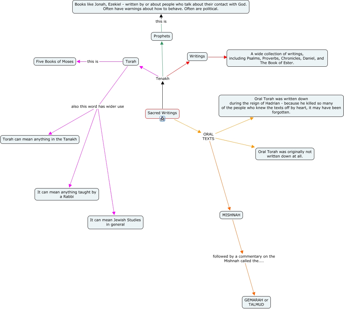 This Concept Map, created with IHMC CmapTools, has information related to: sacredwritings, Sacred Writings Tenakh Prophets, Prophets this is Books like Jonah, Ezekiel - written by or about people who talk about their contact with God. Often have warnings about how to behave. Often are political., Sacred Writings ORAL TEXTS Oral Torah was written down during the reign of Hadrian - because he killed so many of the people who knew the texts off by heart, it may have been forgotten., Sacred Writings Tenakh Writings, Sacred Writings ORAL TEXTS MISHNAH, Torah also this word has wider use It can mean Jewish Studies in general, Sacred Writings ORAL TEXTS Oral Torah was originally not written down at all., Writings these are A wide collection of writings, including Psalms, Proverbs, Chronicles, Daniel, and The Book of Ester., Torah also this word has wider use It can mean anything taught by a Rabbi, Sacred Writings Tenakh Torah, Torah this is Five Books of Moses, MISHNAH followed by a commentary on the Mishnah called the.... GEMARAH or TALMUD, Torah also this word has wider use Torah can mean anything in the Tanakh