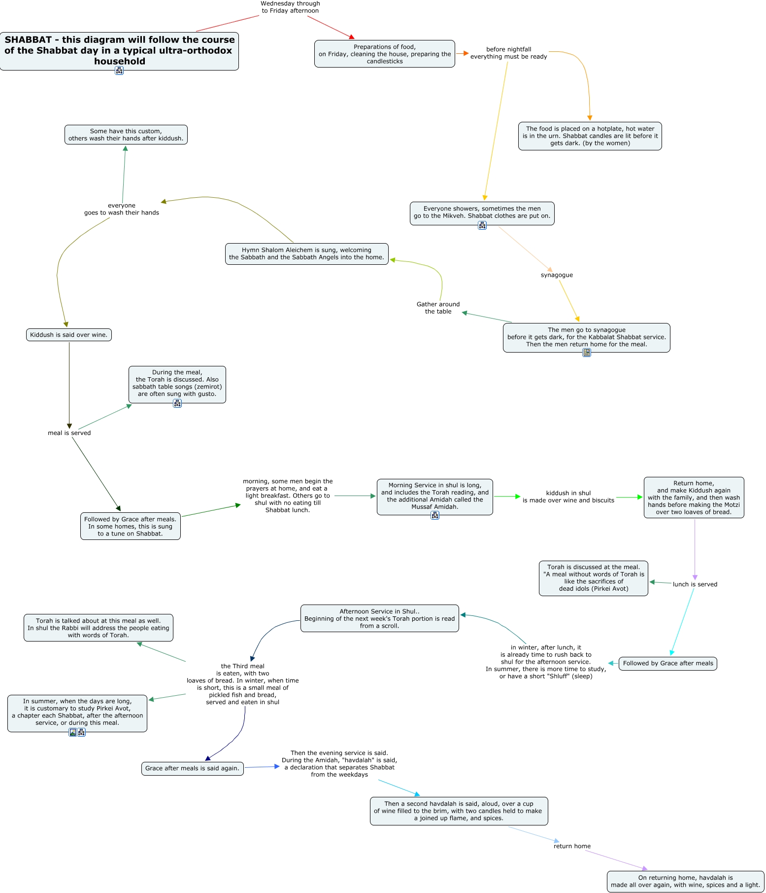 This Concept Map, created with IHMC CmapTools, has information related to: shabbatday, Preparations of food, on Friday, cleaning the house, preparing the candlesticks before nightfall everything must be ready Everyone showers, sometimes the men go to the Mikveh. Shabbat clothes are put on., Hymn Shalom Aleichem is sung, welcoming the Sabbath and the Sabbath Angels into the home. everyone goes to wash their hands Some have this custom, others wash their hands after kiddush., The men go to synagogue before it gets dark, for the Kabbalat Shabbat service. Then the men return home for the meal. Gather around the table Hymn Shalom Aleichem is sung, welcoming the Sabbath and the Sabbath Angels into the home., Everyone showers, sometimes the men go to the Mikveh. Shabbat clothes are put on. synagogue The men go to synagogue before it gets dark, for the Kabbalat Shabbat service. Then the men return home for the meal., Return home, and make Kiddush again with the family, and then wash hands before making the Motzi over two loaves of bread. lunch is served Followed by Grace after meals, SHABBAT - this diagram will follow the course of the Shabbat day in a typical ultra-orthodox household Wednesday through to Friday afternoon Preparations of food, on Friday, cleaning the house, preparing the candlesticks, Morning Service in shul is long, and includes the Torah reading, and the additional Amidah called the Mussaf Amidah. kiddush in shul is made over wine and biscuits Return home, and make Kiddush again with the family, and then wash hands before making the Motzi over two loaves of bread., Return home, and make Kiddush again with the family, and then wash hands before making the Motzi over two loaves of bread. lunch is served Torah is discussed at the meal. "A meal without words of Torah is like the sacrifices of dead idols (Pirkei Avot), Kiddush is said over wine. meal is served Followed by Grace after meals. In some homes, this is sung to a tune on Shabbat., Afternoon Service in Shul.. Beginning of the next week's Torah portion is read from a scroll. the Third meal is eaten, with two loaves of bread. In winter, when time is short, this is a small meal of pickled fish and bread, served and eaten in shul In summer, when the days are long, it is customary to study Pirkei Avot, a chapter each Shabbat, after the afternoon service, or during this meal., Followed by Grace after meals. In some homes, this is sung to a tune on Shabbat. morning, some men begin the prayers at home, and eat a light breakfast. Others go to shul with no eating till Shabbat lunch. Morning Service in shul is long, and includes the Torah reading, and the additional Amidah called the Mussaf Amidah., Grace after meals is said again. Then the evening service is said. During the Amidah, "havdalah" is said, a declaration that separates Shabbat from the weekdays Then a second havdalah is said, aloud, over a cup of wine filled to the brim, with two candles held to make a joined up flame, and spices., Followed by Grace after meals in winter, after lunch, it is already time to rush back to shul for the afternoon service. In summer, there is more time to study, or have a short "Shluff" (sleep) Afternoon Service in Shul.. Beginning of the next week's Torah portion is read from a scroll., Kiddush is said over wine. meal is served During the meal, the Torah is discussed. Also sabbath table songs (zemirot) are often sung with gusto., Preparations of food, on Friday, cleaning the house, preparing the candlesticks before nightfall everything must be ready The food is placed on a hotplate, hot water is in the urn. Shabbat candles are lit before it gets dark. (by the women), Hymn Shalom Aleichem is sung, welcoming the Sabbath and the Sabbath Angels into the home. everyone goes to wash their hands Kiddush is said over wine., Then a second havdalah is said, aloud, over a cup of wine filled to the brim, with two candles held to make a joined up flame, and spices. return home On returning home, havdalah is made all over again, with wine, spices and a light., Afternoon Service in Shul.. Beginning of the next week's Torah portion is read from a scroll. the Third meal is eaten, with two loaves of bread. In winter, when time is short, this is a small meal of pickled fish and bread, served and eaten in shul Grace after meals is said again., Afternoon Service in Shul.. Beginning of the next week's Torah portion is read from a scroll. the Third meal is eaten, with two loaves of bread. In winter, when time is short, this is a small meal of pickled fish and bread, served and eaten in shul Torah is talked about at this meal as well. In shul the Rabbi will address the people eating with words of Torah.