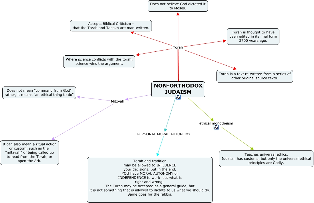 This Concept Map, created with IHMC CmapTools, has information related to: non-orthodox, NON-ORTHODOX JUDAISM Torah Accepts Biblical Criticism - that the Torah and Tanakh are man-written., NON-ORTHODOX JUDAISM Torah Torah is a text re-written from a series of other original source texts., NON-ORTHODOX JUDAISM Torah Does not believe God dictated it to Moses., NON-ORTHODOX JUDAISM Torah Where science conflicts with the torah, science wins the argument., NON-ORTHODOX JUDAISM Mitzvah Does not mean "command from God" rather, it means "an ethical thing to do", NON-ORTHODOX JUDAISM Torah Torah is thought to have been edited in its final form 2700 years ago., NON-ORTHODOX JUDAISM Mitzvah It can also mean a ritual action or custom, such as the "mitzvah" of being called up to read from the Torah, or open the Ark., NON-ORTHODOX JUDAISM ethical monotheism Teaches universal ethics. Judaism has customs, but only the universal ethical principles are Godly., NON-ORTHODOX JUDAISM PERSONAL MORAL AUTONOMY Torah and tradition may be allowed to INFLUENCE your decisions, but in the end, YOU have MORAL AUTONOMY or INDEPENDENCE to work out what is right and wrong. The Torah may be accepted as a general guide, but it is not something that is allowed to dictate to us what we should do. Same goes for the rabbis.