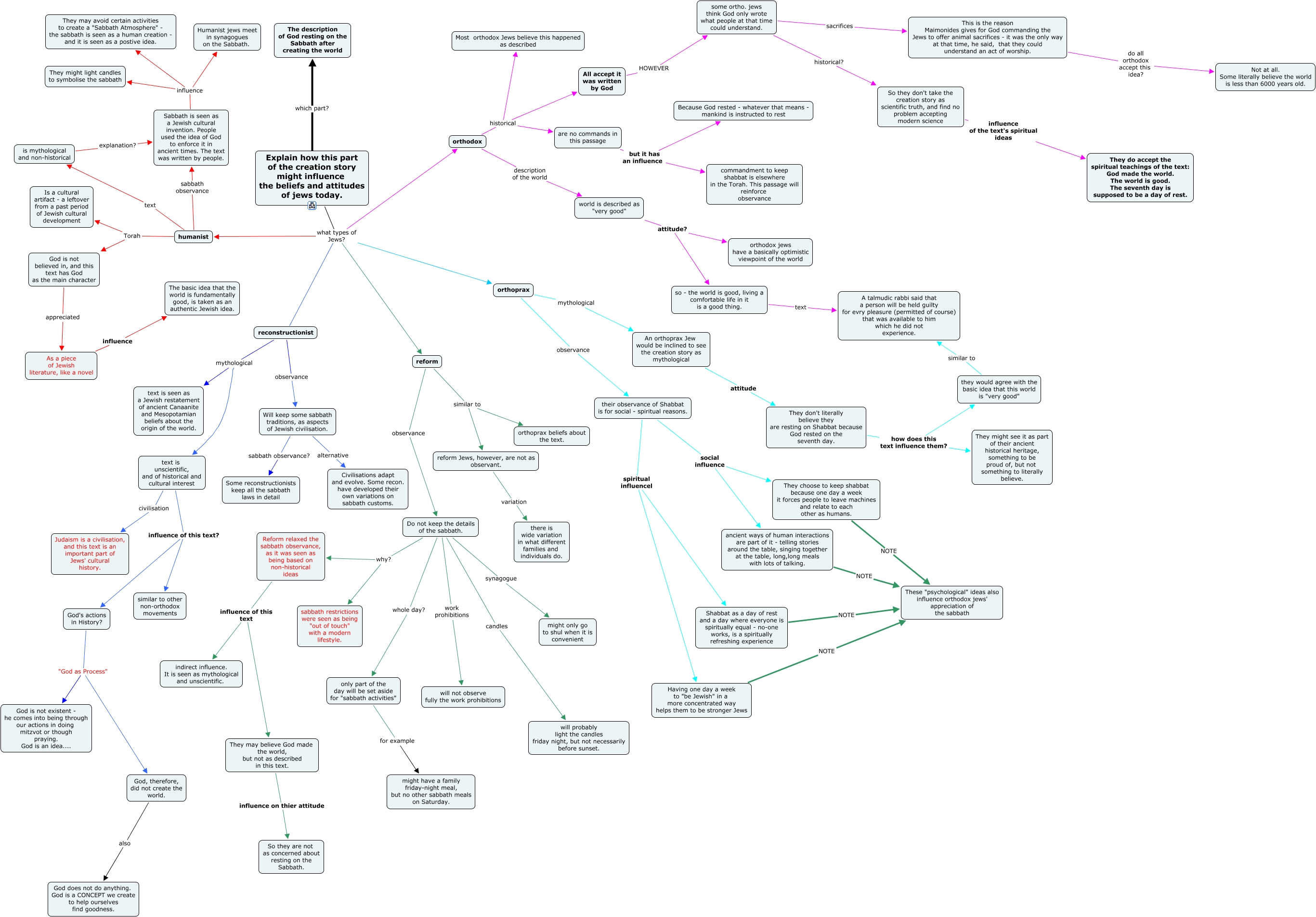 This Concept Map, created with IHMC CmapTools, has information related to: shabbatcreation, world is described as "very good" attitude? orthodox jews have a basically optimistic viewpoint of the world, Explain how this part of the creation story might influence the beliefs and attitudes of jews today. what types of Jews? orthodox, They don't literally believe they are resting on Shabbat because God rested on the seventh day. how does this text influence them? They might see it as part of their ancient historical heritage, something to be proud of, but not something to literally believe., Explain how this part of the creation story might influence the beliefs and attitudes of jews today. what types of Jews? reconstructionist, Will keep some sabbath traditions, as aspects of Jewish civilisation. alternative Civilisations adapt and evolve. Some recon. have developed their own variations on sabbath customs., humanist text is mythological and non-historical, reconstructionist mythological text is seen as a Jewish restatement of ancient Canaanite and Mesopotamian beliefs about the origin of the world., An orthoprax Jew would be inclined to see the creation story as mythological attitude They don't literally believe they are resting on Shabbat because God rested on the seventh day., orthodox description of the world world is described as "very good", Do not keep the details of the sabbath. why? Reform relaxed the sabbath observance, as it was seen as being based on non-historical ideas, Do not keep the details of the sabbath. candles will probably light the candles friday night, but not necessarily before sunset., reform Jews, however, are not as observant. variation there is wide variation in what different families and individuals do., Do not keep the details of the sabbath. work prohibitions will not observe fully the work prohibitions, Reform relaxed the sabbath observance, as it was seen as being based on non-historical ideas influence of this text indirect influence. It is seen as mythological and unscientific., text is unscientific, and of historical and cultural interest influence of this text? God's actions in History?, So they don't take the creation story as scientific truth, and find no problem accepting modern science influence of the text's spiritual ideas They do accept the spiritual teachings of the text: God made the world. The world is good. The seventh day is supposed to be a day of rest., are no commands in this passage but it has an influence Because God rested - whatever that means - mankind is instructed to rest, humanist Torah God is not believed in, and this text has God as the main character, All accept it was written by God HOWEVER some ortho. jews think God only wrote what people at that time could understand., Explain how this part of the creation story might influence the beliefs and attitudes of jews today. what types of Jews? orthoprax