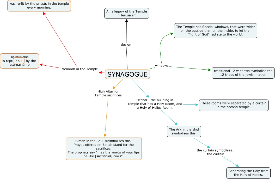 This Concept Map, created with IHMC CmapTools, has information related to: synagogue, SYNAGOGUE Hechal - the building in Temple that has a Holy Room, and a Holy of Holies Room. These rooms were separated by a curtain in the second temple., SYNAGOGUE High Altar for Temple sacrifices Bimah in the Shul suymbolises this- Prayes offered on Bimah stand for the sacrifices. The prophets say "may the words of your lips be like [sacrificial] cows"., SYNAGOGUE design An allegory of the Temple in Jerusalem, SYNAGOGUE Menorah in the Temple In shul this is represented by the eternal lamp, SYNAGOGUE Hechal - the building in Temple that has a Holy Room, and a Holy of Holies Room. The Ark in the shul symbolises this., The Ark in the shul symbolises this. the curtain symbolises... the curtain. Separating the Holy from the Holy of Holies., SYNAGOGUE windows The Temple has Special windows, that were wider on the outside than on the inside, to let the "light of God" radiate to the world., SYNAGOGUE windows traditional 12 windows symbolise the 12 tribes of the jewish nation., SYNAGOGUE Menorah in the Temple was re-lit by the priests in the temple every morning.