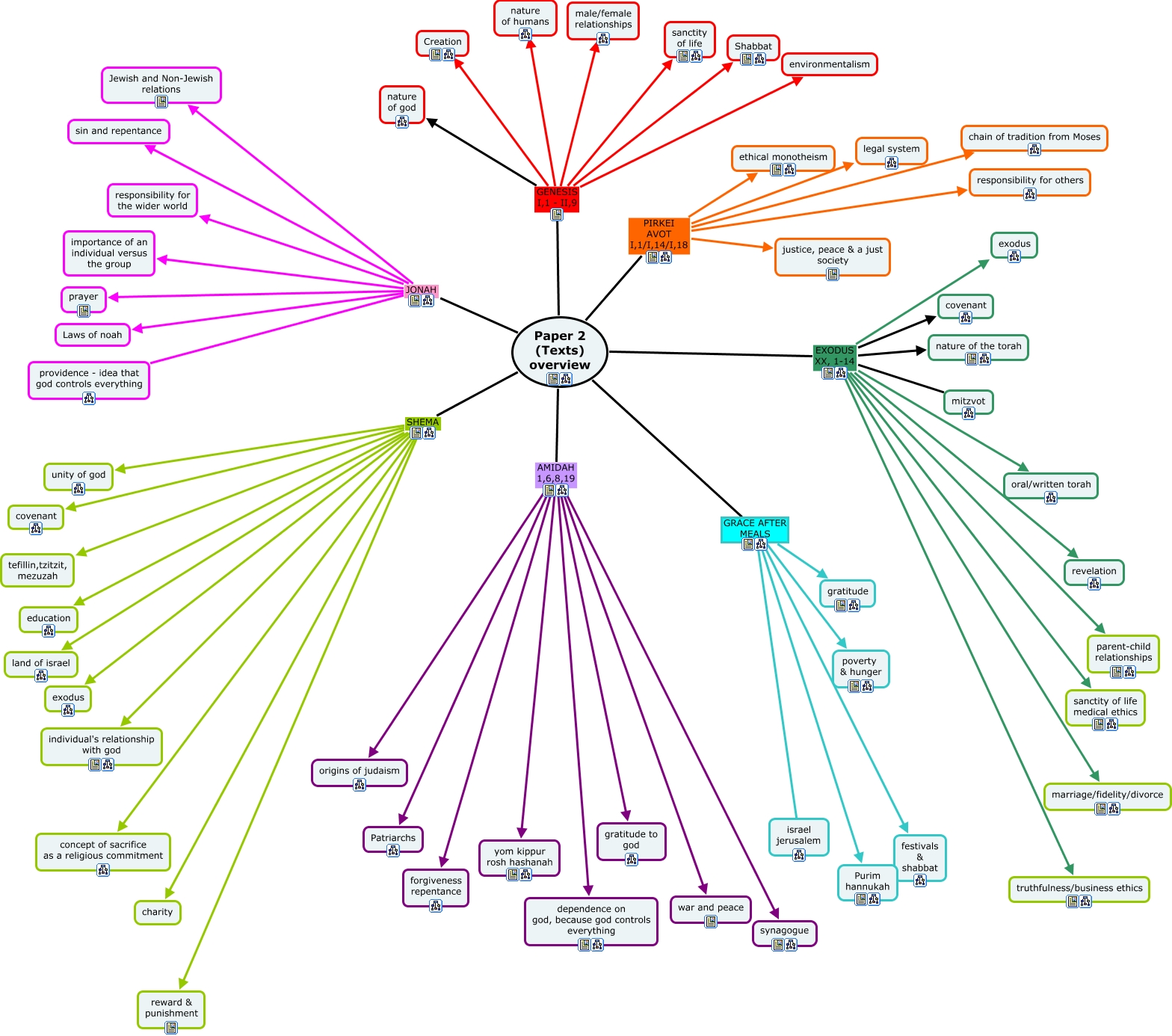This Concept Map, created with IHMC CmapTools, has information related to: syllabustwo, Paper 2 (Texts) overview EXODUS XX, 1-14 marriage/fidelity/divorce, Paper 2 (Texts) overview SHEMA reward & punishment, Paper 2 (Texts) overview SHEMA education, Paper 2 (Texts) overview EXODUS XX, 1-14 exodus, Paper 2 (Texts) overview PIRKEI AVOT I,1/I,14/I,18 justice, peace & a just society, Paper 2 (Texts) overview JONAH sin and repentance, Paper 2 (Texts) overview AMIDAH 1,6,8,19 war and peace, Paper 2 (Texts) overview AMIDAH 1,6,8,19 Patriarchs, Paper 2 (Texts) overview EXODUS XX, 1-14 mitzvot, Paper 2 (Texts) overview PIRKEI AVOT I,1/I,14/I,18 chain of tradition from Moses, Paper 2 (Texts) overview EXODUS XX, 1-14 oral/written torah, Paper 2 (Texts) overview AMIDAH 1,6,8,19 synagogue, Paper 2 (Texts) overview JONAH Laws of noah, Paper 2 (Texts) overview JONAH prayer, Paper 2 (Texts) overview AMIDAH 1,6,8,19 forgiveness repentance, Paper 2 (Texts) overview GENESIS I,1 - II,9 sanctity of life, Paper 2 (Texts) overview GENESIS I,1 - II,9 male/female relationships, Paper 2 (Texts) overview SHEMA covenant, Paper 2 (Texts) overview AMIDAH 1,6,8,19 yom kippur rosh hashanah, Paper 2 (Texts) overview EXODUS XX, 1-14 nature of the torah