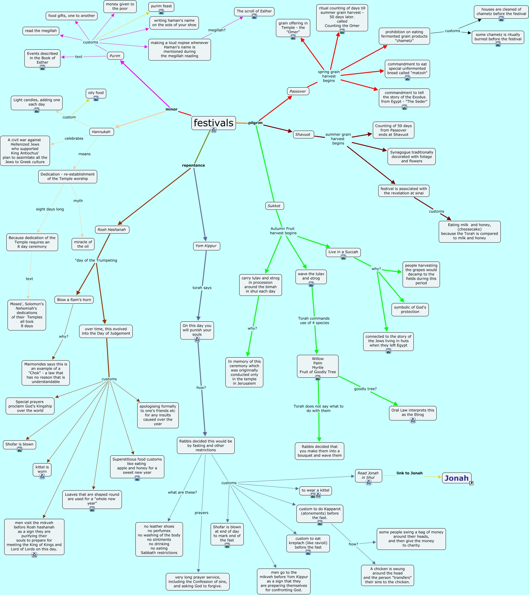 This Concept Map, created with IHMC CmapTools, has information related to: festivals, festivals pilgrim Shavuot, Rabbis decided this would be by fasting and other restrictions prayers very long prayer service, including the Confession of sins, and asking God to forgive., Live in a Succah why? connected to the story of the Jews living in huts when they left Egypt, festivals pilgrim Passover, festivals minor Hannukah, Rabbis decided this would be by fasting and other restrictions customs Shofar is blown at end of day to mark end of the fast, Passover spring grain harvest begins commandment to tell the story of the Exodus from Egypt - "The Seder", over time, this evolved into the Day of Judgement customs apologising formally to one's friends etc for any insults caused over the year, Blow a Ram's horn why? Maimonides says this is an example of a "Chok" - a law that has no reason that is understandable, Purim customs money given to the poor, over time, this evolved into the Day of Judgement customs Loaves that are shaped round are used for a "whole new year", Hannukah custom Light candles, adding one each day, festivals minor Purim, Passover spring grain harvest begins commandment to eat special unfermented bread called "matzoh", festival is associated with the revelation at sinai customs Eating milk and honey, (cheesecake) because the Torah is compared to milk and honey, Purim customs read the megillah, festivals repentance Yom Kippur, over time, this evolved into the Day of Judgement customs Superstitious food customs like eating apple and honey for a sweet new year, Live in a Succah why? people harvesting the grapes would decamp to the fields during this period, Sukkot Autumn Fruit harvest begins wave the lulav and etrog