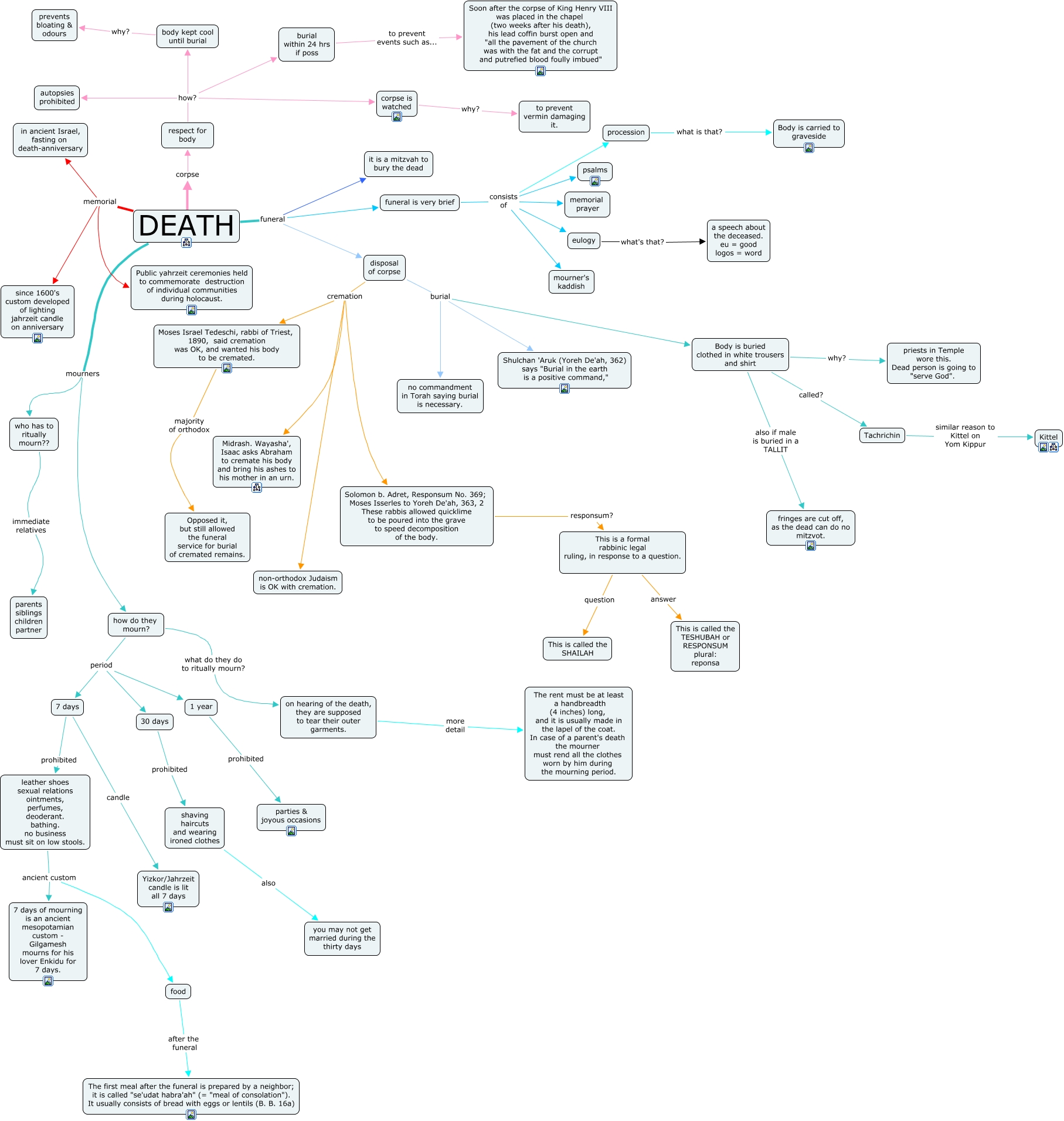 This Concept Map, created with IHMC CmapTools, has information related to: death, disposal of corpse burial Body is buried clothed in white trousers and shirt, Tachrichin similar reason to Kittel on Yom Kippur Kittel, DEATH corpse respect for body, procession what is that? Body is carried to graveside, DEATH memorial Public yahrzeit ceremonies held to commemorate destruction of individual communities during holocaust., disposal of corpse cremation Moses Israel Tedeschi, rabbi of Triest, 1890, said cremation was OK, and wanted his body to be cremated., respect for body how? body kept cool until burial, Body is buried clothed in white trousers and shirt called? Tachrichin, burial within 24 hrs if poss to prevent events such as... Soon after the corpse of King Henry VIII was placed in the chapel (two weeks after his death), his lead coffin burst open and "all the pavement of the church was with the fat and the corrupt and putrefied blood foully imbued", 7 days candle Yizkor/Jahrzeit candle is lit all 7 days, leather shoes sexual relations ointments, perfumes, deoderant. bathing. no business must sit on low stools. ancient custom food, how do they mourn? period 7 days, Body is buried clothed in white trousers and shirt why? priests in Temple wore this. Dead person is going to "serve God"., funeral is very brief consists of mourner's kaddish, disposal of corpse burial no commandment in Torah saying burial is necessary., food after the funeral The first meal after the funeral is prepared by a neighbor; it is called "se'udat habra'ah" (= "meal of consolation"). It usually consists of bread with eggs or lentils (B. B. 16a), DEATH memorial since 1600's custom developed of lighting jahrzeit candle on anniversary, DEATH funeral funeral is very brief, shaving haircuts and wearing ironed clothes also you may not get married during the thirty days, Moses Israel Tedeschi, rabbi of Triest, 1890, said cremation was OK, and wanted his body to be cremated. majority of orthodox Opposed it, but still allowed the funeral service for burial of cremated remains.