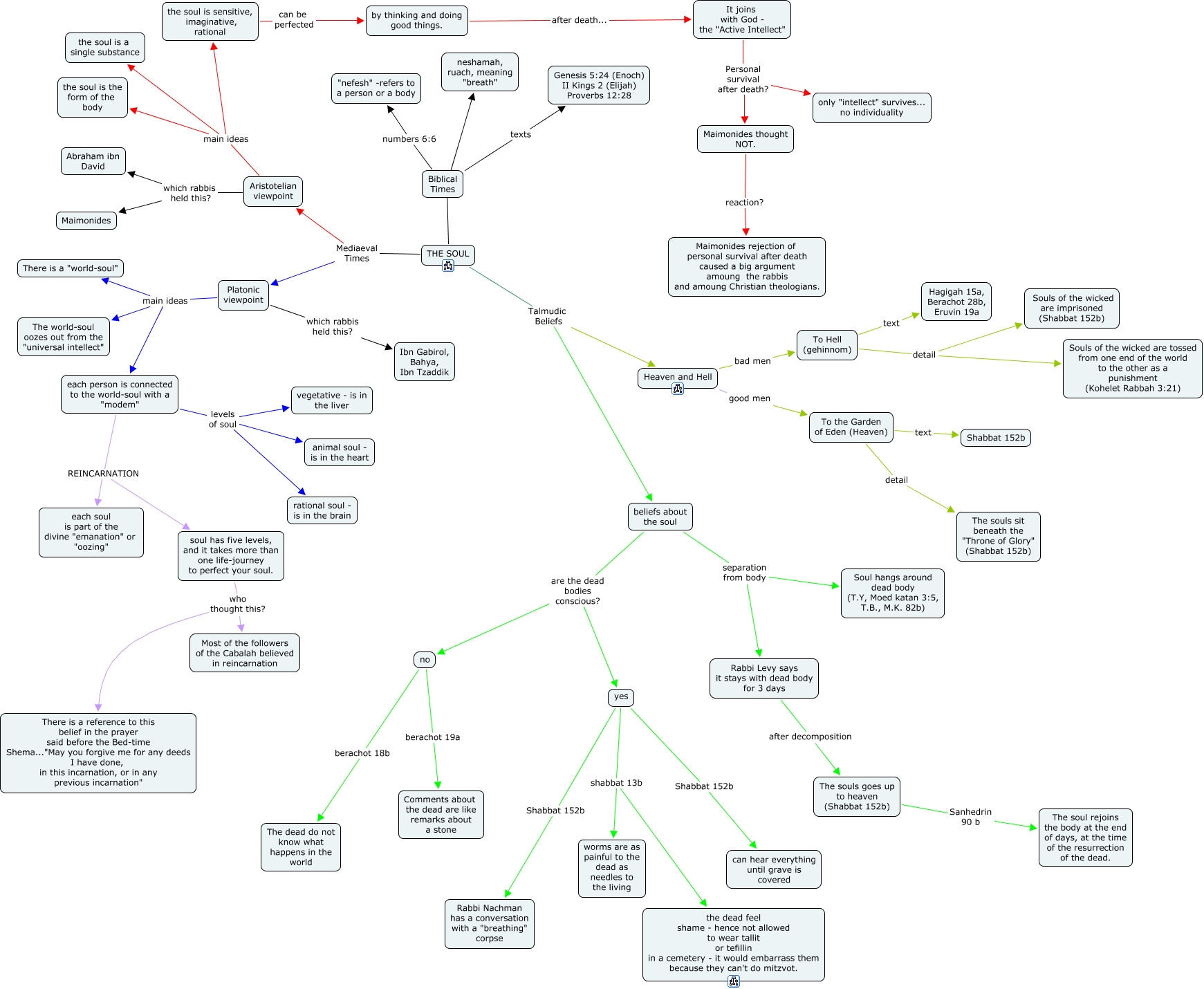 This Concept Map, created with IHMC CmapTools, has information related to: soul, yes shabbat 13b the dead feel shame - hence not allowed to wear tallit or tefillin in a cemetery - it would embarrass them because they can't do mitzvot., Aristotelian viewpoint main ideas the soul is the form of the body, Aristotelian viewpoint which rabbis held this? Abraham ibn David, beliefs about the soul are the dead bodies conscious? yes, each person is connected to the world-soul with a "modem" levels of soul rational soul - is in the brain, soul has five levels, and it takes more than one life-journey to perfect your soul. who thought this? Most of the followers of the Cabalah believed in reincarnation, THE SOUL Talmudic Beliefs Heaven and Hell, Biblical Times texts Genesis 5:24 (Enoch) II Kings 2 (Elijah) Proverbs 12:28, To Hell (gehinnom) detail Souls of the wicked are tossed from one end of the world to the other as a punishment (Kohelet Rabbah 3:21), Heaven and Hell good men To the Garden of Eden (Heaven), It joins with God - the "Active Intellect" Personal survival after death? only "intellect" survives... no individuality, Aristotelian viewpoint which rabbis held this? Maimonides, Platonic viewpoint main ideas each person is connected to the world-soul with a "modem", THE SOUL Talmudic Beliefs beliefs about the soul, beliefs about the soul separation from body Rabbi Levy says it stays with dead body for 3 days, by thinking and doing good things. after death... It joins with God - the "Active Intellect", Aristotelian viewpoint main ideas the soul is a single substance, each person is connected to the world-soul with a "modem" levels of soul animal soul - is in the heart, The souls goes up to heaven (Shabbat 152b) Sanhedrin 90 b The soul rejoins the body at the end of days, at the time of the resurrection of the dead., no berachot 19a Comments about the dead are like remarks about a stone