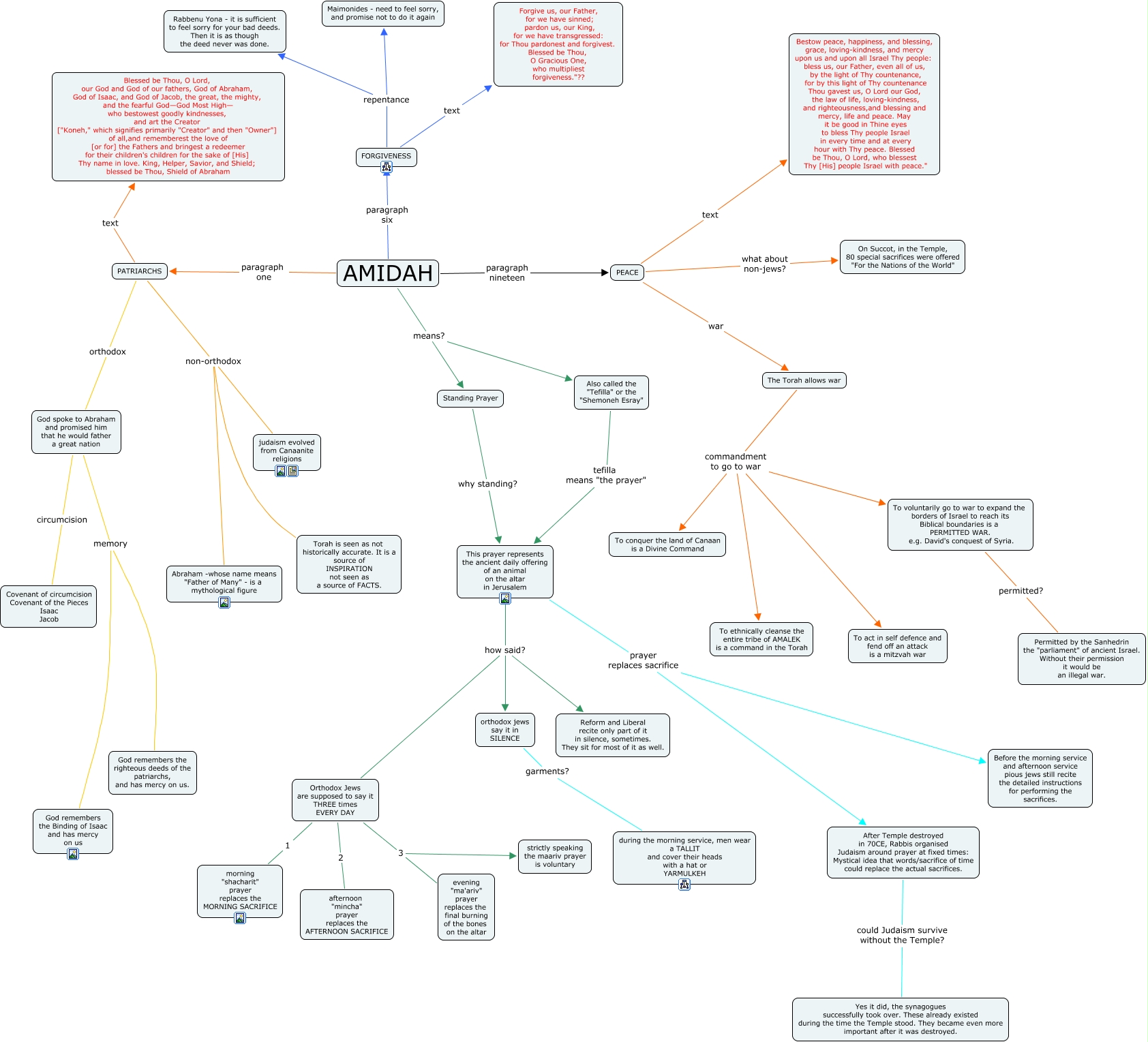 This Concept Map, created with IHMC CmapTools, has information related to: amidah01, This prayer represents the ancient daily offering of an animal on the altar in Jerusalem prayer replaces sacrifice After Temple destroyed in 70CE, Rabbis organised Judaism around prayer at fixed times: Mystical idea that words/sacrifice of time could replace the actual sacrifices., PATRIARCHS non-orthodox Torah is seen as not historically accurate. It is a source of INSPIRATION not seen as a source of FACTS., PATRIARCHS non-orthodox judaism evolved from Canaanite religions, After Temple destroyed in 70CE, Rabbis organised Judaism around prayer at fixed times: Mystical idea that words/sacrifice of time could replace the actual sacrifices. could Judaism survive without the Temple? Yes it did, the synagogues successfully took over. These already existed during the time the Temple stood. They became even more important after it was destroyed., Orthodox Jews are supposed to say it THREE times EVERY DAY 1 morning "shacharit" prayer replaces the MORNING SACRIFICE, FORGIVENESS repentance Maimonides - need to feel sorry, and promise not to do it again, AMIDAH paragraph one PATRIARCHS, The Torah allows war commandment to go to war To conquer the land of Canaan is a Divine Command, orthodox jews say it in SILENCE garments? during the morning service, men wear a TALLIT and cover their heads with a hat or YARMULKEH, This prayer represents the ancient daily offering of an animal on the altar in Jerusalem how said? Reform and Liberal recite only part of it in silence, sometimes. They sit for most of it as well., Orthodox Jews are supposed to say it THREE times EVERY DAY 2 afternoon "mincha" prayer replaces the AFTERNOON SACRIFICE, PATRIARCHS orthodox God spoke to Abraham and promised him that he would father a great nation, The Torah allows war commandment to go to war To ethnically cleanse the entire tribe of AMALEK is a command in the Torah, This prayer represents the ancient daily offering of an animal on the altar in Jerusalem how said? orthodox jews say it in SILENCE, God spoke to Abraham and promised him that he would father a great nation circumcision Covenant of circumcision Covenant of the Pieces Isaac Jacob, AMIDAH paragraph six FORGIVENESS, Also called the "Tefilla" or the "Shemoneh Esray" tefilla means "the prayer" This prayer represents the ancient daily offering of an animal on the altar in Jerusalem, FORGIVENESS text Forgive us, our Father, for we have sinned; pardon us, our King, for we have transgressed: for Thou pardonest and forgivest. Blessed be Thou, O Gracious One, who multipliest forgiveness."??, AMIDAH means? Standing Prayer, God spoke to Abraham and promised him that he would father a great nation memory God remembers the righteous deeds of the patriarchs, and has mercy on us.