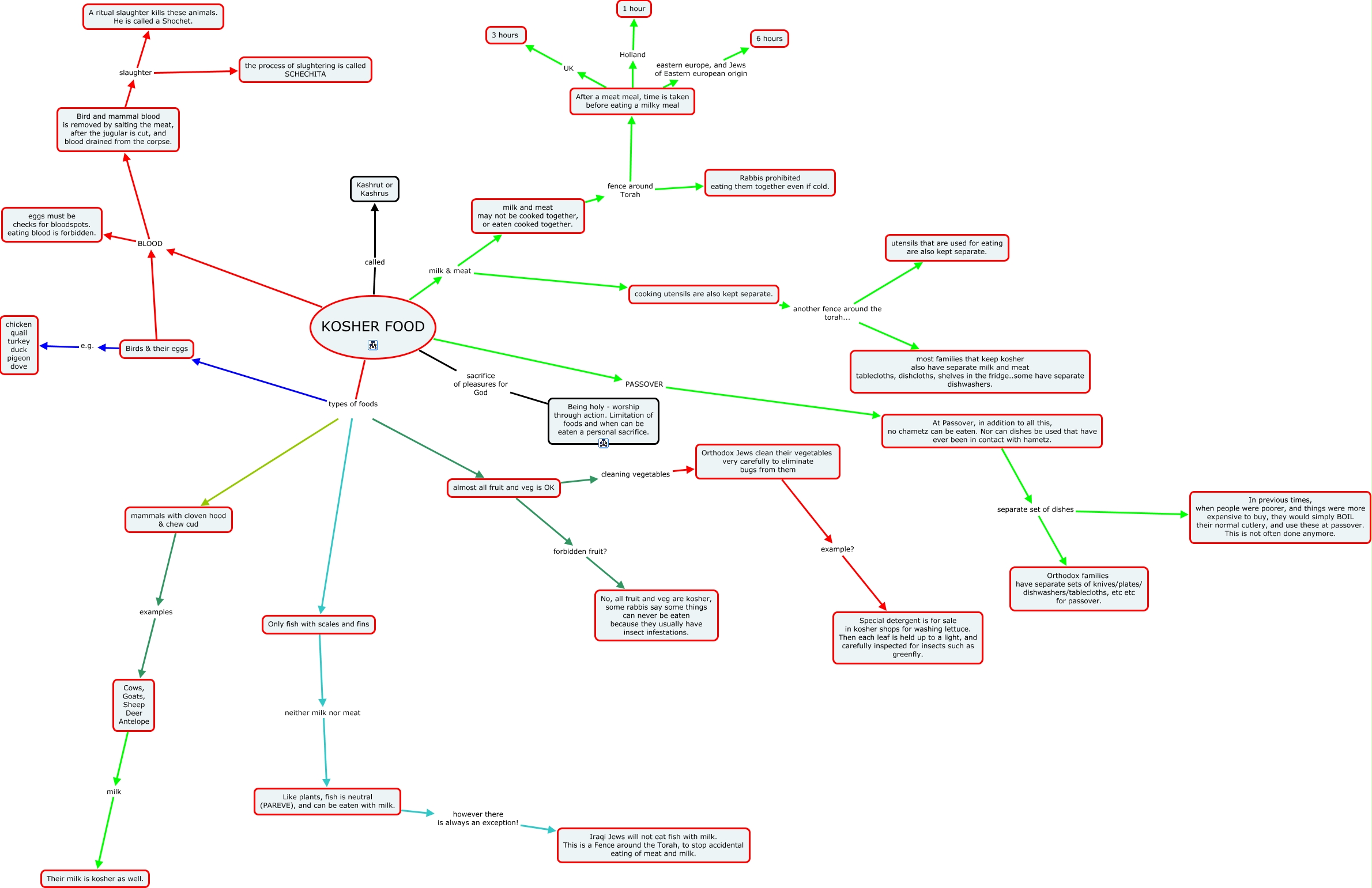 This Concept Map, created with IHMC CmapTools, has information related to: kosher, KOSHER FOOD BLOOD Bird and mammal blood is removed by salting the meat, after the jugular is cut, and blood drained from the corpse., Birds & their eggs BLOOD eggs must be checks for bloodspots. eating blood is forbidden., At Passover, in addition to all this, no chametz can be eaten. Nor can dishes be used that have ever been in contact with hametz. separate set of dishes Orthodox families have separate sets of knives/plates/ dishwashers/tablecloths, etc etc for passover., KOSHER FOOD milk & meat cooking utensils are also kept separate., KOSHER FOOD types of foods mammals with cloven hood & chew cud, KOSHER FOOD BLOOD eggs must be checks for bloodspots. eating blood is forbidden., KOSHER FOOD PASSOVER At Passover, in addition to all this, no chametz can be eaten. Nor can dishes be used that have ever been in contact with hametz., KOSHER FOOD types of foods Birds & their eggs, Birds & their eggs BLOOD Bird and mammal blood is removed by salting the meat, after the jugular is cut, and blood drained from the corpse., After a meat meal, time is taken before eating a milky meal UK 3 hours, mammals with cloven hood & chew cud examples Cows, Goats, Sheep Deer Antelope, After a meat meal, time is taken before eating a milky meal eastern europe, and Jews of Eastern european origin 6 hours, At Passover, in addition to all this, no chametz can be eaten. Nor can dishes be used that have ever been in contact with hametz. separate set of dishes In previous times, when people were poorer, and things were more expensive to buy, they would simply BOIL their normal cutlery, and use these at passover. This is not often done anymore., Only fish with scales and fins neither milk nor meat Like plants, fish is neutral (PAREVE), and can be eaten with milk., KOSHER FOOD types of foods Only fish with scales and fins, KOSHER FOOD milk & meat milk and meat may not be cooked together, or eaten cooked together., Like plants, fish is neutral (PAREVE), and can be eaten with milk. however there is always an exception! Iraqi Jews will not eat fish with milk. This is a Fence around the Torah, to stop accidental eating of meat and milk., Cows, Goats, Sheep Deer Antelope milk Their milk is kosher as well., cooking utensils are also kept separate. another fence around the torah... most families that keep kosher also have separate milk and meat tablecloths, dishcloths, shelves in the fridge..some have separate dishwashers., KOSHER FOOD types of foods almost all fruit and veg is OK