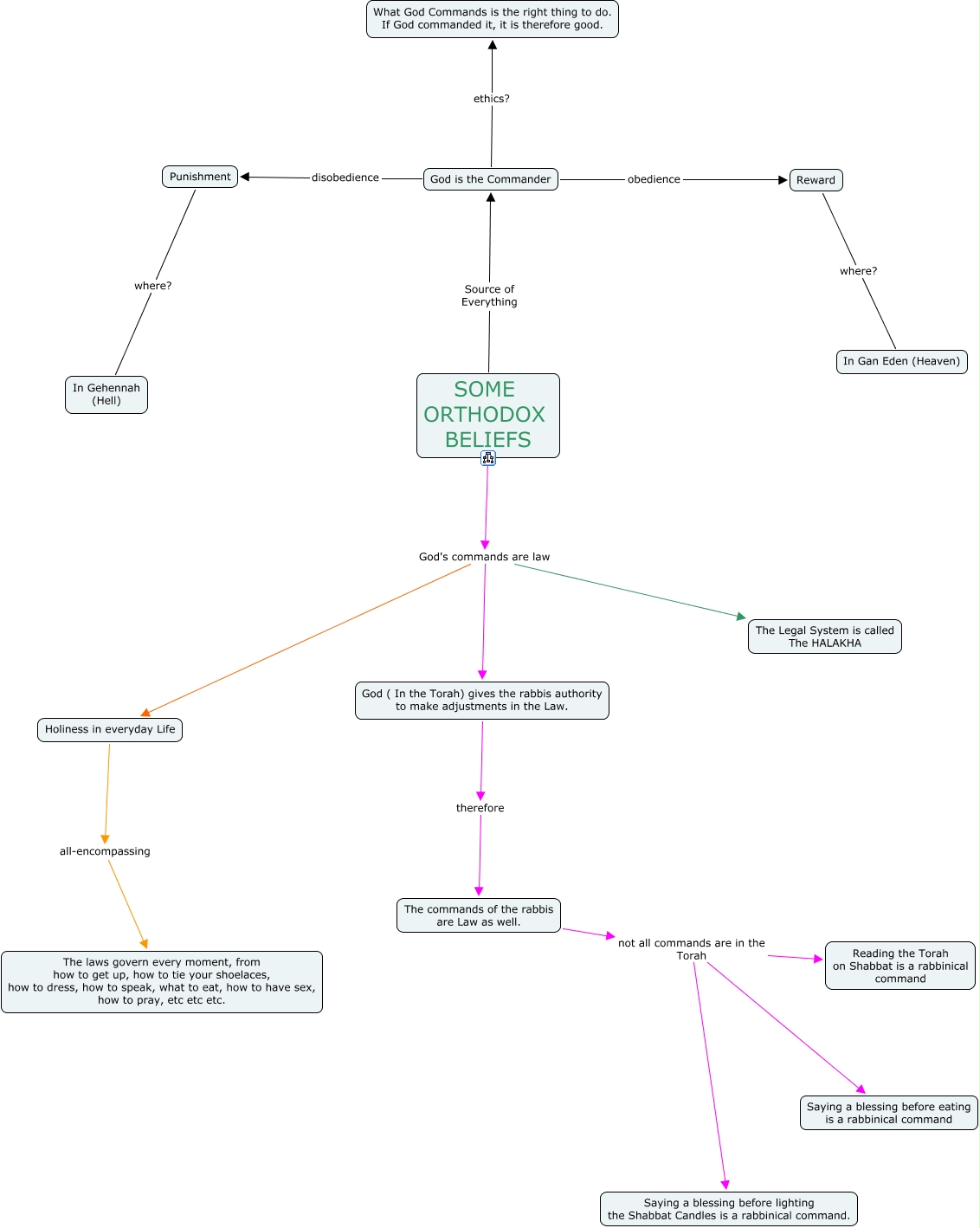 This Concept Map, created with IHMC CmapTools, has information related to: orthodoxy, Reward where? In Gan Eden (Heaven), SOME ORTHODOX BELIEFS God's commands are law Holiness in everyday Life, God is the Commander ethics? What God Commands is the right thing to do. If God commanded it, it is therefore good., God is the Commander disobedience Punishment, The commands of the rabbis are Law as well. not all commands are in the Torah Saying a blessing before eating is a rabbinical command, SOME ORTHODOX BELIEFS God's commands are law God ( In the Torah) gives the rabbis authority to make adjustments in the Law., God is the Commander obedience Reward, SOME ORTHODOX BELIEFS Source of Everything God is the Commander, Punishment where? In Gehennah (Hell), SOME ORTHODOX BELIEFS God's commands are law The Legal System is called The HALAKHA, The commands of the rabbis are Law as well. not all commands are in the Torah Reading the Torah on Shabbat is a rabbinical command, God ( In the Torah) gives the rabbis authority to make adjustments in the Law. therefore The commands of the rabbis are Law as well., The commands of the rabbis are Law as well. not all commands are in the Torah Saying a blessing before lighting the Shabbat Candles is a rabbinical command., Holiness in everyday Life all-encompassing The laws govern every moment, from how to get up, how to tie your shoelaces, how to dress, how to speak, what to eat, how to have sex, how to pray, etc etc etc.
