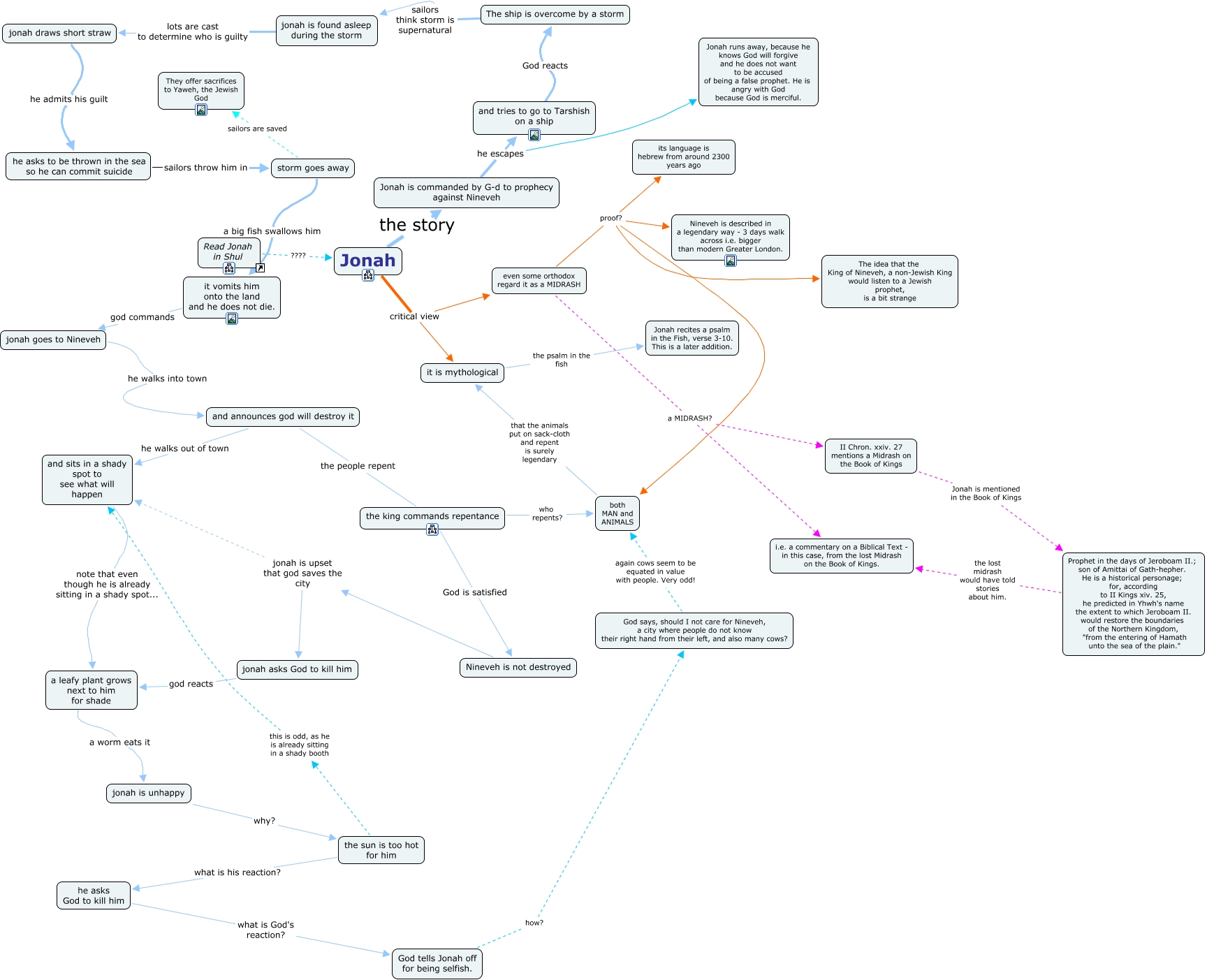 This Concept Map, created with IHMC CmapTools, has information related to: jonah01, jonah draws short straw he admits his guilt he asks to be thrown in the sea so he can commit suicide, Jonah critical view it is mythological, The ship is overcome by a storm sailors think storm is supernatural jonah is found asleep during the storm, jonah is found asleep during the storm lots are cast to determine who is guilty jonah draws short straw, jonah asks God to kill him god reacts a leafy plant grows next to him for shade, Nineveh is not destroyed jonah is upset that god saves the city and sits in a shady spot to see what will happen, God tells Jonah off for being selfish. how? God says, should I not care for Nineveh, a city where people do not know their right hand from their left, and also many cows?, even some orthodox regard it as a MIDRASH proof? Nineveh is described in a legendary way - 3 days walk across i.e. bigger than modern Greater London., he asks God to kill him what is God's reaction? God tells Jonah off for being selfish., Nineveh is not destroyed jonah is upset that god saves the city jonah asks God to kill him, and sits in a shady spot to see what will happen note that even though he is already sitting in a shady spot... a leafy plant grows next to him for shade, storm goes away sailors are saved They offer sacrifices to Yaweh, the Jewish God, even some orthodox regard it as a MIDRASH proof? both MAN and ANIMALS, even some orthodox regard it as a MIDRASH proof? The idea that the King of Nineveh, a non-Jewish King would listen to a Jewish prophet, is a bit strange, Jonah critical view even some orthodox regard it as a MIDRASH, Prophet in the days of Jeroboam II.; son of Amittai of Gath-hepher. He is a historical personage; for, according to II Kings xiv. 25, he predicted in Yhwh's name the extent to which Jeroboam II. would restore the boundaries of the Northern Kingdom, "from the entering of Hamath unto the sea of the plain." the lost midrash would have told stories about him. i.e. a commentary on a Biblical Text - in this case, from the lost Midrash on the Book of Kings., it is mythological the psalm in the fish Jonah recites a psalm in the Fish, verse 3-10. This is a later addition., even some orthodox regard it as a MIDRASH proof? its language is hebrew from around 2300 years ago, a leafy plant grows next to him for shade a worm eats it jonah is unhappy, God says, should I not care for Nineveh, a city where people do not know their right hand from their left, and also many cows? again cows seem to be equated in value with people. Very odd! both MAN and ANIMALS