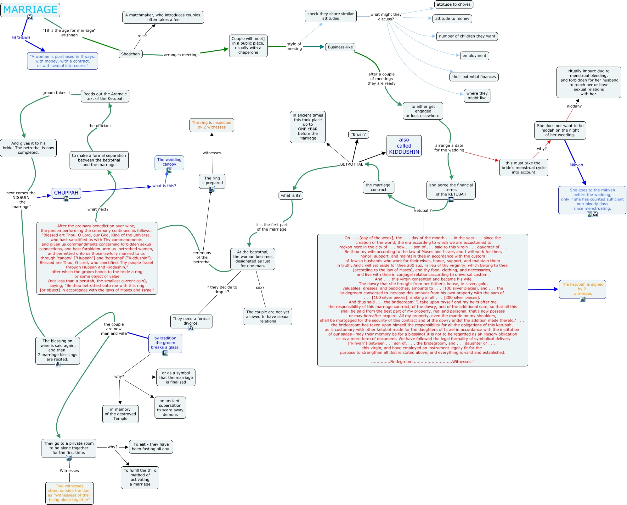 This Concept Map, created with IHMC CmapTools, has information related to: marriage, MARRIAGE MISHNAH "A woman is purchased in 3 ways: with money, with a contract, or with sexual intercourse", After the ordinary benediction over wine, the person performing the ceremony continues as follows: "Blessed art Thou, O Lord, our God, King of the universe, who hast sanctified us with Thy commandments and given us commandments concerning forbidden sexual connections, and hast forbidden unto us betrothed women, and permitted unto us those lawfully married to us through 'canopy' ["Huppah"] and 'betrothal' ["Kiddushin"]. Blessed are Thou, O Lord, who sanctifiest Thy people Israel through Huppah and Kiddushin," after which the groom hands to the bride a ring or some object of value (not less than a perutah, the smallest current coin), saying, "Be thou betrothed unto me with this ring [or object] in accordance with the laws of Moses and Israel" what next? to make a formal separation between the betrothal and the marriage, and agree the financial terms of the KETUBAH ketubah? the marriage contract, Business-like after a couple of meetings they are ready to either get engaged or look elsewhere., They go to a private room to be alone together for the first time. why? To eat - they have been fasting all day., Reads out the Aramaic text of the Ketubah groom takes it And gives it to his bride. The betrothal is now completed., She does not want to be niddah on the night of her wedding. Mikvah She goes to the mikveh before the wedding, only if she has counted sufficient non-bloody days since menstruating., At the betrothal, the woman becomes designated as just for one man. ceremony of the betrothal The ring is prepared, The blessing on wine is said again, and then 7 marriage blessings are recited. the couple are now man and wife by tradition the groom breaks a glass., and agree the financial terms of the KETUBAH ketubah? On . . . [day of the week], the . . . day of the month . . . in the year . . . since the creation of the world, the era according to which we are accustomed to reckon here in the city of . . . how . . . son of . . . said to this virgin . . . daughter of . . . 'Be thou my wife according to the law of Moses and Israel, and I will work for thee, honor, support, and maintain thee in accordance with the custom of Jewish husbands who work for their wives, honor, support, and maintain them in truth. And I will set aside for thee 200 zuz, in lieu of thy virginity, which belong to thee (according to the law of Moses), and thy food, clothing, and necessaries, and live with thee in conjugal relationsaccording to universal custom. ' And . . . this virgin consented and became his wife. The dowry that she brought from her father's house, in silver, gold, valuables, dresses, and bedclothes, amounts to . . . [100 silver pieces], and . . . the bridegroom consented to increase this amount from his own property with the sum of . . . [100 silver pieces], making in all . . . [200 silver pieces]. And thus said . . . the bridegroom, 'I take upon myself and my heirs after me the responsibility of this marriage contract, of the dowry, and of the additional sum, so that all this shall be paid from the best part of my property, real and personal, that I now possess or may hereafter acquire. All my property, even the mantle on my shoulders, shall be mortgaged for the security of this contract and of the dowry andof the addition made thereto.' . . . the bridegroom has taken upon himself the responsibility for all the obligations of this ketubah, as is customary with other ketubot made for the daughters of Israel in accordance with the institution of our sages—may their memory be for a blessing! It is not to be regarded as an illusory obligation or as a mere form of document. We have followed the legal formality of symbolical delivery ["kinyan"] between . . . son of. . . , the bridegroom, and . . . daughter of . . . , this virgin, and have employed an instrument legally fit for the purpose to strengthen all that is stated above, and everything is valid and established. ..............Bridegroom.............................Witnesses.", Couple will meet] in a public place, usually with a chaperone style of meeting Business-like, And gives it to his bride. The betrothal is now completed. next comes the NISSUIN - the "marriage" The blessing on wine is said again, and then 7 marriage blessings are recited., check they share similar attitudes what might they discuss? their potential finances, by tradition the groom breaks a glass. why? an ancient superstition to scare away demons, At the betrothal, the woman becomes designated as just for one man. ceremony of the betrothal After the ordinary benediction over wine, the person performing the ceremony continues as follows: "Blessed art Thou, O Lord, our God, King of the universe, who hast sanctified us with Thy commandments and given us commandments concerning forbidden sexual connections, and hast forbidden unto us betrothed women, and permitted unto us those lawfully married to us through 'canopy' ["Huppah"] and 'betrothal' ["Kiddushin"]. Blessed are Thou, O Lord, who sanctifiest Thy people Israel through Huppah and Kiddushin," after which the groom hands to the bride a ring or some object of value (not less than a perutah, the smallest current coin), saying, "Be thou betrothed unto me with this ring [or object] in accordance with the laws of Moses and Israel", They go to a private room to be alone together for the first time. why? To fulfill the third method of activating a marriage, the marriage contract BETROTHAL also called KIDDUSHIN, CHUPPAH what is this? The wedding canopy, the marriage contract BETROTHAL what is it?, On . . . [day of the week], the . . . day of the month . . . in the year . . . since the creation of the world, the era according to which we are accustomed to reckon here in the city of . . . how . . . son of . . . said to this virgin . . . daughter of . . .