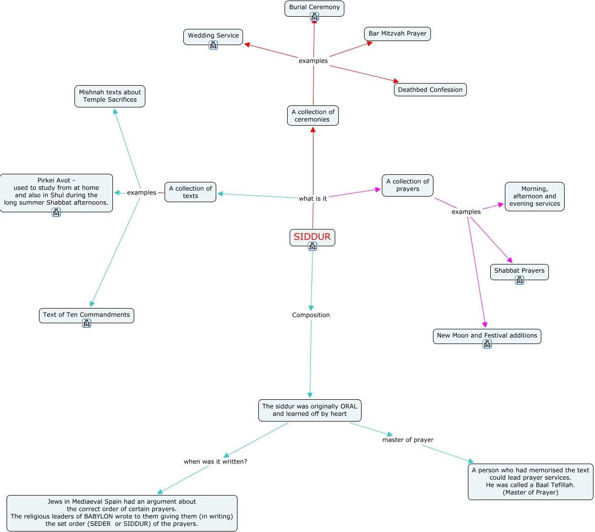 This Concept Map, created with IHMC CmapTools, has information related to: siddur, SIDDUR Composition The siddur was originally ORAL and learned off by heart, A collection of texts examples Text of Ten Commandments, A collection of ceremonies examples Deathbed Confession, SIDDUR what is it A collection of texts, A collection of texts examples Pirkei Avot - used to study from at home and also in Shul during the long summer Shabbat afternoons., The siddur was originally ORAL and learned off by heart master of prayer A person who had memorised the text could lead prayer services. He was called a Baal Tefillah. (Master of Prayer), A collection of prayers examples New Moon and Festival additions, The siddur was originally ORAL and learned off by heart when was it written? Jews in Mediaeval Spain had an argument about the correct order of certain prayers. The religious leaders of BABYLON wrote to them giving them (in writing) the set order (SEDER or SIDDUR) of the prayers., A collection of texts examples Mishnah texts about Temple Sacrifices, A collection of ceremonies examples Bar Mitzvah Prayer, A collection of prayers examples Morning, afternoon and evening services, SIDDUR what is it A collection of ceremonies, A collection of ceremonies examples Wedding Service, A collection of ceremonies examples Burial Ceremony, A collection of prayers examples Shabbat Prayers, SIDDUR what is it A collection of prayers