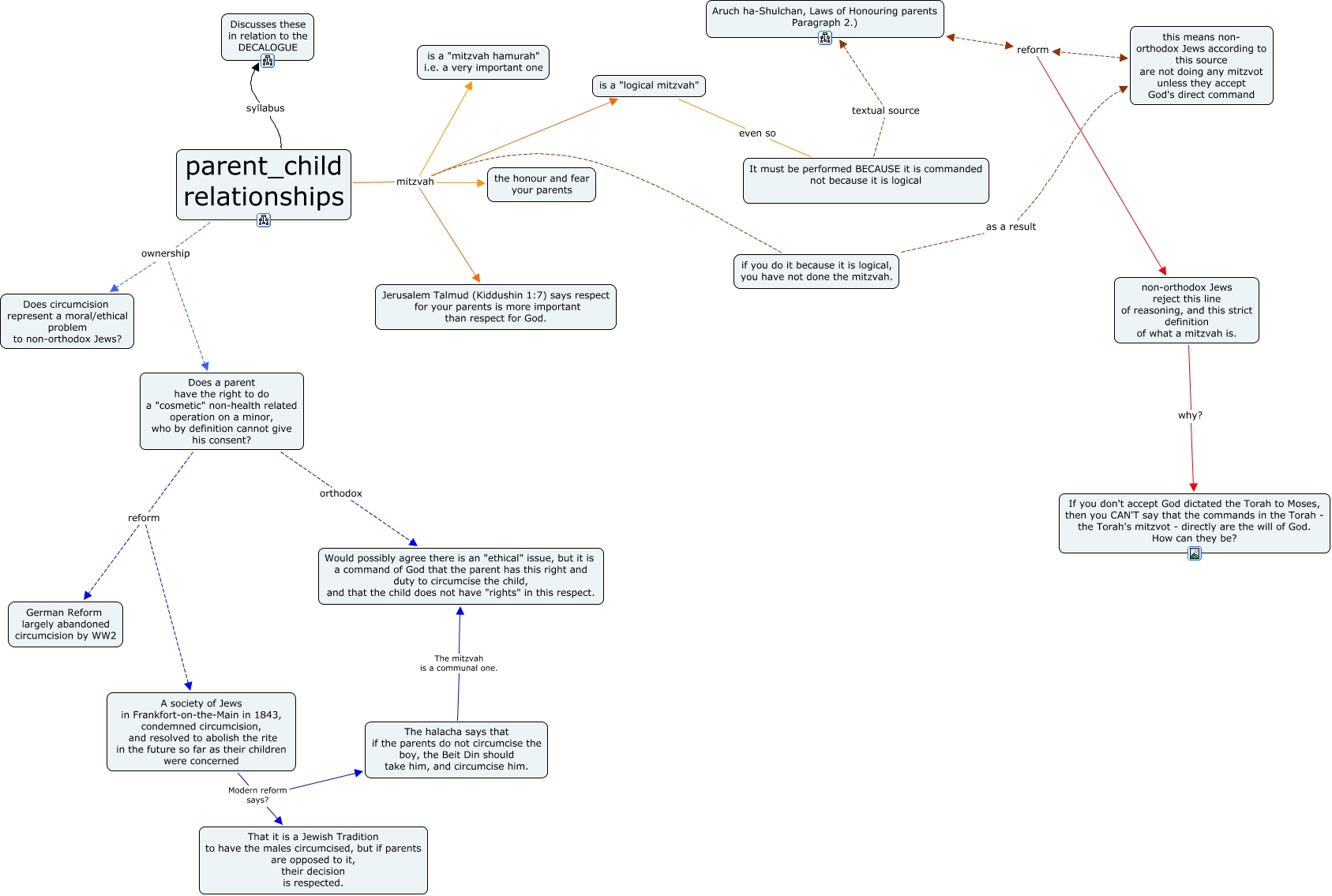 This Concept Map, created with IHMC CmapTools, has information related to: parentchild, parent_child relationships mitzvah the honour and fear your parents, parent_child relationships syllabus Discusses these in relation to the DECALOGUE, if you do it because it is logical, you have not done the mitzvah. as a result this means non- orthodox Jews according to this source are not doing any mitzvot unless they accept God's direct command, parent_child relationships ownership Does circumcision represent a moral/ethical problem to non-orthodox Jews?, Aruch ha-Shulchan, Laws of Honouring parents Paragraph 2.) reform this means non- orthodox Jews according to this source are not doing any mitzvot unless they accept God's direct command, parent_child relationships mitzvah if you do it because it is logical, you have not done the mitzvah., Aruch ha-Shulchan, Laws of Honouring parents Paragraph 2.) reform non-orthodox Jews reject this line of reasoning, and this strict definition of what a mitzvah is., Does a parent have the right to do a "cosmetic" non-health related operation on a minor, who by definition cannot give his consent? orthodox Would possibly agree there is an "ethical" issue, but it is a command of God that the parent has this right and duty to circumcise the child, and that the child does not have "rights" in this respect., parent_child relationships ownership Does a parent have the right to do a "cosmetic" non-health related operation on a minor, who by definition cannot give his consent?, parent_child relationships mitzvah Jerusalem Talmud (Kiddushin 1:7) says respect for your parents is more important than respect for God., parent_child relationships mitzvah is a "mitzvah hamurah" i.e. a very important one, Does a parent have the right to do a "cosmetic" non-health related operation on a minor, who by definition cannot give his consent? reform A society of Jews in Frankfort-on-the-Main in 1843, condemned circumcision, and resolved to abolish the rite in the future so far as their children were concerned, non-orthodox Jews reject this line of reasoning, and this strict definition of what a mitzvah is. why? If you don't accept God dictated the Torah to Moses, then you CAN'T say that the commands in the Torah - the Torah's mitzvot - directly are the will of God. How can they be?, Does a parent have the right to do a "cosmetic" non-health related operation on a minor, who by definition cannot give his consent? reform German Reform largely abandoned circumcision by WW2, A society of Jews in Frankfort-on-the-Main in 1843, condemned circumcision, and resolved to abolish the rite in the future so far as their children were concerned Modern reform says? That it is a Jewish Tradition to have the males circumcised, but if parents are opposed to it, their decision is respected., It must be performed BECAUSE it is commanded not because it is logical textual source Aruch ha-Shulchan, Laws of Honouring parents Paragraph 2.), The halacha says that if the parents do not circumcise the boy, the Beit Din should take him, and circumcise him. The mitzvah is a communal one. Would possibly agree there is an "ethical" issue, but it is a command of God that the parent has this right and duty to circumcise the child, and that the child does not have "rights" in this respect., parent_child relationships mitzvah is a "logical mitzvah", is a "logical mitzvah" even so It must be performed BECAUSE it is commanded not because it is logical, A society of Jews in Frankfort-on-the-Main in 1843, condemned circumcision, and resolved to abolish the rite in the future so far as their children were concerned Modern reform says? The halacha says that if the parents do not circumcise the boy, the Beit Din should take him, and circumcise him.
