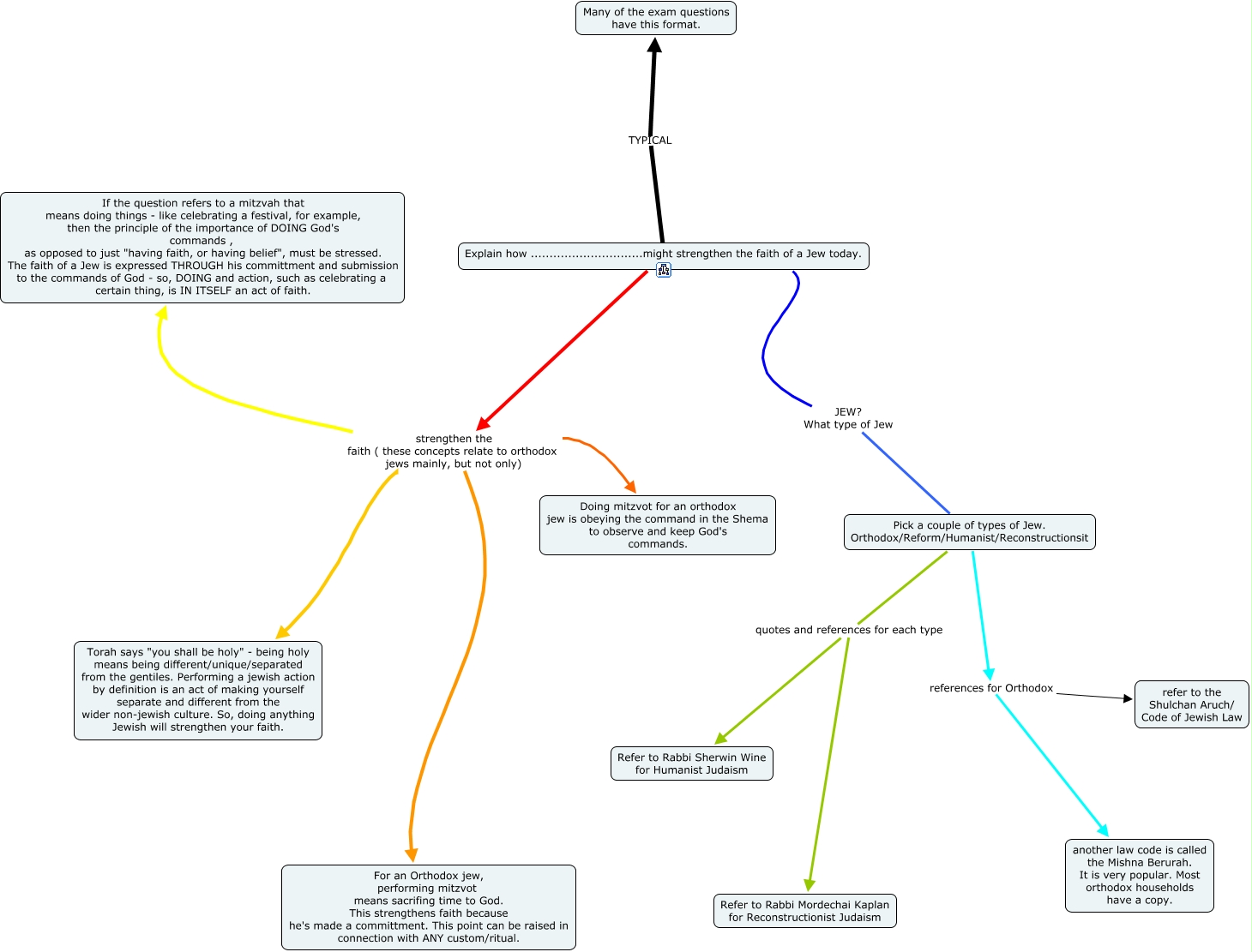 This Concept Map, created with IHMC CmapTools, has information related to: explainfaith, Explain how ..............................might strengthen the faith of a Jew today. strengthen the faith ( these concepts relate to orthodox jews mainly, but not only) Torah says "you shall be holy" - being holy means being different/unique/separated from the gentiles. Performing a jewish action by definition is an act of making yourself separate and different from the wider non-jewish culture. So, doing anything Jewish will strengthen your faith., Pick a couple of types of Jew. Orthodox/Reform/Humanist/Reconstructionsit quotes and references for each type Refer to Rabbi Sherwin Wine for Humanist Judaism, Pick a couple of types of Jew. Orthodox/Reform/Humanist/Reconstructionsit quotes and references for each type Refer to Rabbi Mordechai Kaplan for Reconstructionist Judaism, Explain how ..............................might strengthen the faith of a Jew today. strengthen the faith ( these concepts relate to orthodox jews mainly, but not only) If the question refers to a mitzvah that means doing things - like celebrating a festival, for example, then the principle of the importance of DOING God's commands , as opposed to just "having faith, or having belief", must be stressed. The faith of a Jew is expressed THROUGH his committment and submission to the commands of God - so, DOING and action, such as celebrating a certain thing, is IN ITSELF an act of faith., Pick a couple of types of Jew. Orthodox/Reform/Humanist/Reconstructionsit references for Orthodox refer to the Shulchan Aruch/ Code of Jewish Law, Pick a couple of types of Jew. Orthodox/Reform/Humanist/Reconstructionsit references for Orthodox another law code is called the Mishna Berurah. It is very popular. Most orthodox households have a copy., Explain how ..............................might strengthen the faith of a Jew today. JEW? What type of Jew Pick a couple of types of Jew. Orthodox/Reform/Humanist/Reconstructionsit, Explain how ..............................might strengthen the faith of a Jew today. strengthen the faith ( these concepts relate to orthodox jews mainly, but not only) Doing mitzvot for an orthodox jew is obeying the command in the Shema to observe and keep God's commands., Explain how ..............................might strengthen the faith of a Jew today. strengthen the faith ( these concepts relate to orthodox jews mainly, but not only) For an Orthodox jew, performing mitzvot means sacrifing time to God. This strengthens faith because he's made a committment. This point can be raised in connection with ANY custom/ritual., Explain how ..............................might strengthen the faith of a Jew today. TYPICAL Many of the exam questions have this format.