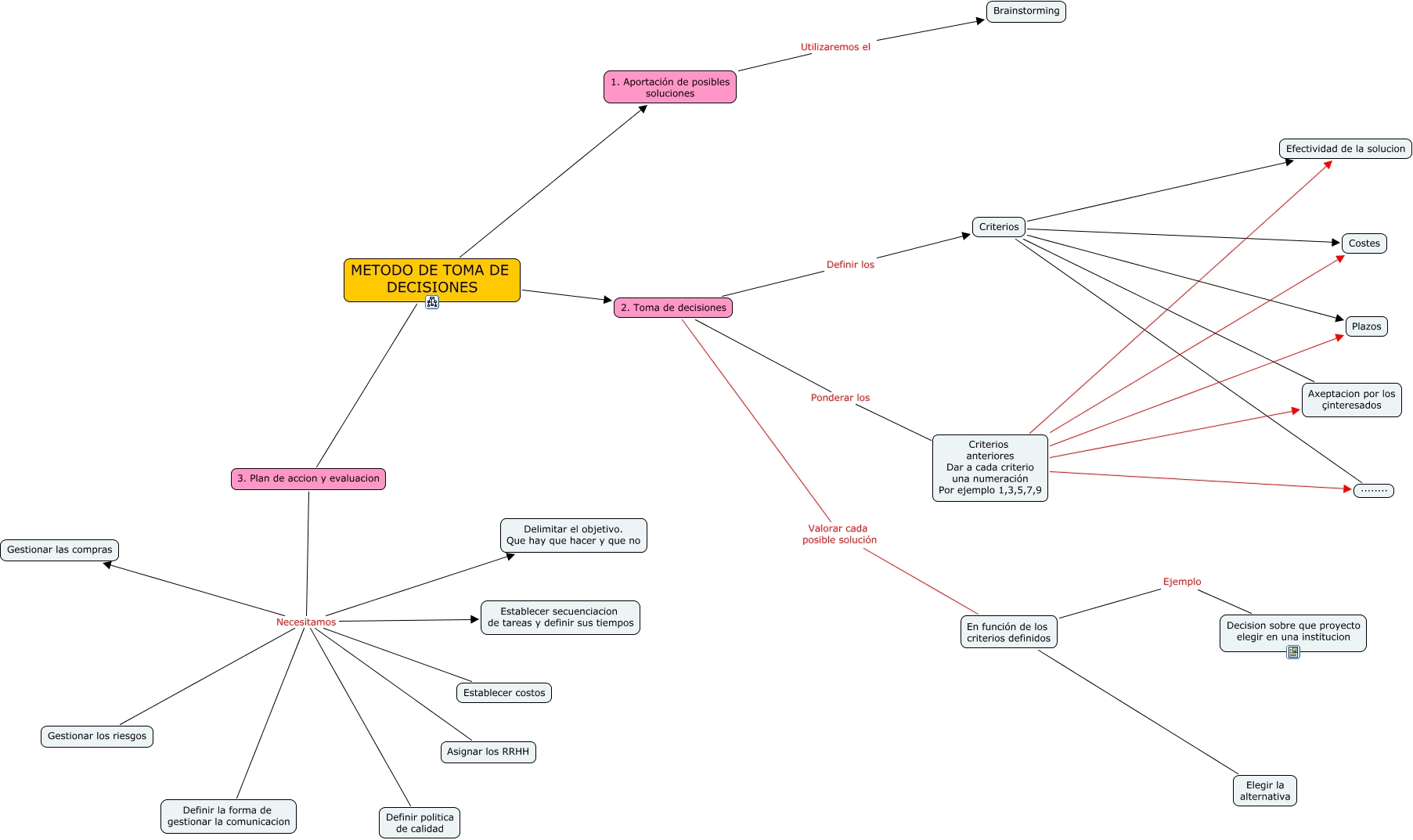 Metodo de toma de decisiones, 3. Plan de accion y evaluacion Necesitamos Establecer secuenciacion de tareas y definir sus tiempos, Criterios Plazos, METODO DE TOMA DE DECISIONES 2. Toma de decisiones, 3. Plan de accion y evaluacion Necesitamos Definir la forma de gestionar la comunicacion, METODO DE TOMA DE DECISIONES 3. Plan de accion y evaluacion, En función de los criterios definidos Ejemplo Decision sobre que proyecto elegir en una institucion, 2. Toma de decisiones Ponderar los Criterios anteriores Dar a cada criterio una numeración Por ejemplo 1,3,5,7,9, Criterios anteriores Dar a cada criterio una numeración Por ejemplo 1,3,5,7,9 ........, Criterios Efectividad de la solucion, Criterios anteriores Dar a cada criterio una numeración Por ejemplo 1,3,5,7,9 Plazos