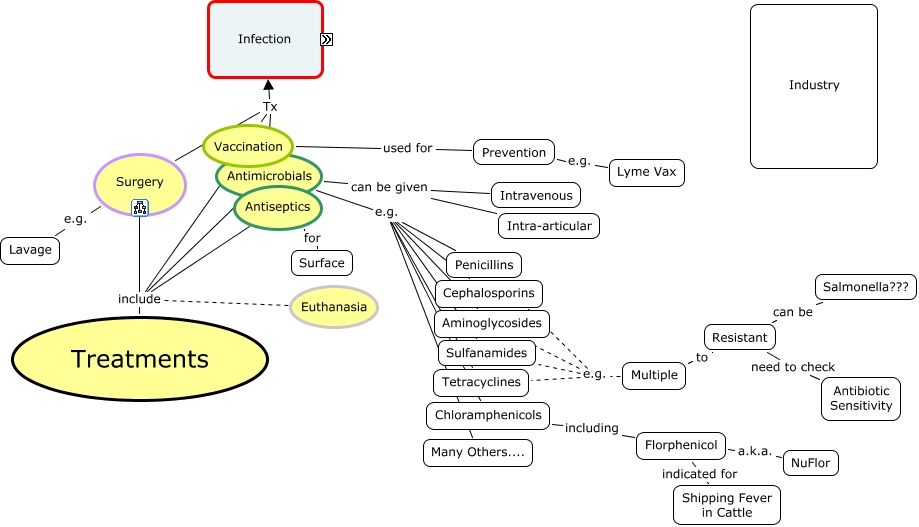 This Concept Map, created with IHMC CmapTools, has information related to: Antibiotics for swollen joint, Vaccination Tx Infection, Antimicrobials e.g. Chloramphenicols, Tick-borne Disease e.g. Rocky Mtn Spotted Fever, Resistant need to check Antibiotic Sensitivity, Tick-borne Disease e.g. Ehlichiosis, Tick-borne Disease e.g. Lyme Disease, Florphenicol a.k.a. NuFlor, Bacterial e.g. Gram Neg, Salmonella??? can be Resistant, Treatments include Euthanasia, Antimicrobials e.g. Aminoglycosides, Infection including Bacterial, Tick-borne Disease e.g. Babesiosis, Multiple e.g. Tetracyclines, Antimicrobials e.g. Tetracyclines, Antimicrobials can be given Intra-articular, Multiple e.g. Sulfanamides, Bacterial e.g. Gram Pos, Antimicrobials e.g. Sulfanamides, Antimicrobials Tx Infection
