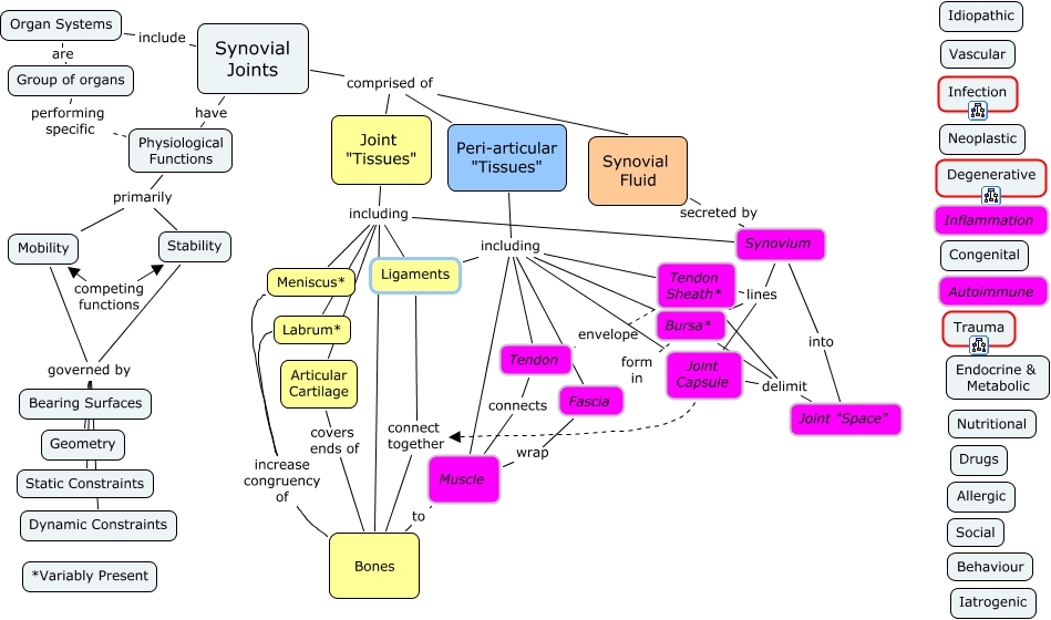 This Concept Map, created with IHMC CmapTools, has information related to: Common Pathologies5, Synovium into Joint "Space", Mobility governed by Bearing Surfaces, Labrum* increase congruency of Bones, Organ Systems include Synovial Joints, Synovial Joints comprised of Peri-articular "Tissues", Synovium lines Bursa*, Joint "Tissues" including Synovium, Tendon connects Muscle, Peri-articular "Tissues" including Fascia, Mobility governed by Static Constraints, Organ Systems are Group of organs, Peri-articular "Tissues" including Muscle, Synovial Fluid secreted by Synovium, Tendon Sheath* envelope Tendon, Group of organs performing specific Physiological Functions, Stability governed by Static Constraints, Synovial Joints have Physiological Functions, Joint "Space" delimit Bursa*, Joint Capsule connect together Bones, Joint "Tissues" including Articular Cartilage