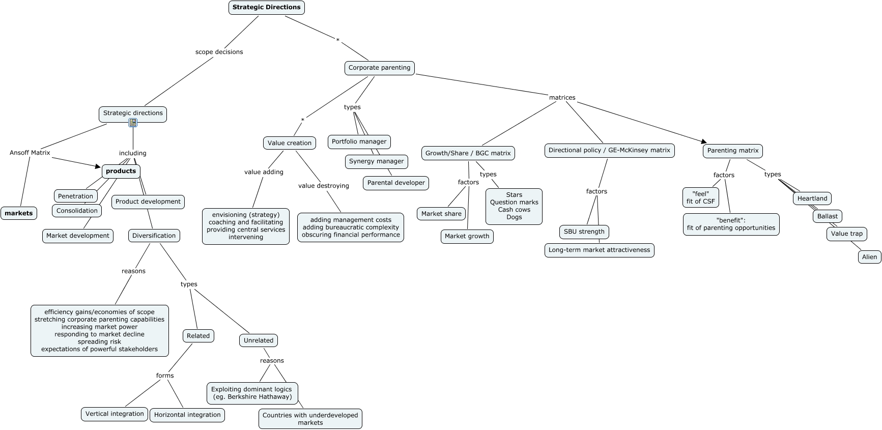 Tämä IHMC CmapToolsilla luotu käsitekartta sisältää tietoa, joka liittyy aiheeseen: Strategic directions, Strategic directions including Consolidation, Related forms Horizontal integration, Corporate parenting matrices Parenting matrix, Growth/Share / BGC matrix factors Market growth, Strategic directions Ansoff Matrix markets, Diversification types Related, Corporate parenting types Synergy manager, Parenting matrix factors "feel" fit of CSF, Unrelated reasons Countries with underdeveloped markets, Growth/Share / BGC matrix factors Market share, Related forms Vertical integration, Strategic directions Ansoff Matrix products, Parenting matrix types Heartland, Directional policy / GE-McKinsey matrix factors Long-term market attractiveness, Directional policy / GE-McKinsey matrix factors SBU strength, Corporate parenting matrices Directional policy / GE-McKinsey matrix, Diversification reasons efficiency gains/economies of scope stretching corporate parenting capabilities increasing market power responding to market decline spreading risk expectations of powerful stakeholders, Strategic directions including Market development, Strategic Directions * Corporate parenting, Strategic Directions scope decisions Strategic directions