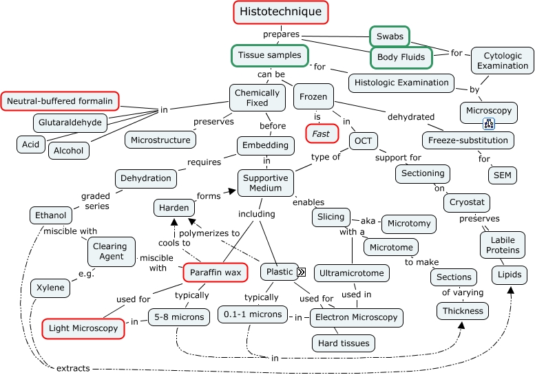 This Concept Map, created with IHMC CmapTools, has information related to: Histological Methods, Frozen in OCT, Chemically Fixed preserves Microstructure, Frozen is Fast, Chemically Fixed in Acid, Embedding requires Dehydration, Histotechnique prepares Tissue samples, Cryostat preserves Lipids, Plastic polymerizes to Harden, Freeze-substitution for SEM, Sectioning on Cryostat, Microtome to make Sections, Chemically Fixed in Glutaraldehyde, Frozen dehydrated Freeze-substitution, Tissue samples can be Frozen, Ultramicrotome used in Electron Microscopy, Chemically Fixed in Alcohol, Slicing with a Microtome, Ethanol miscible with Clearing Agent, Plastic resins including Methyl methacrylate, Paraffin wax used for Light Microscopy