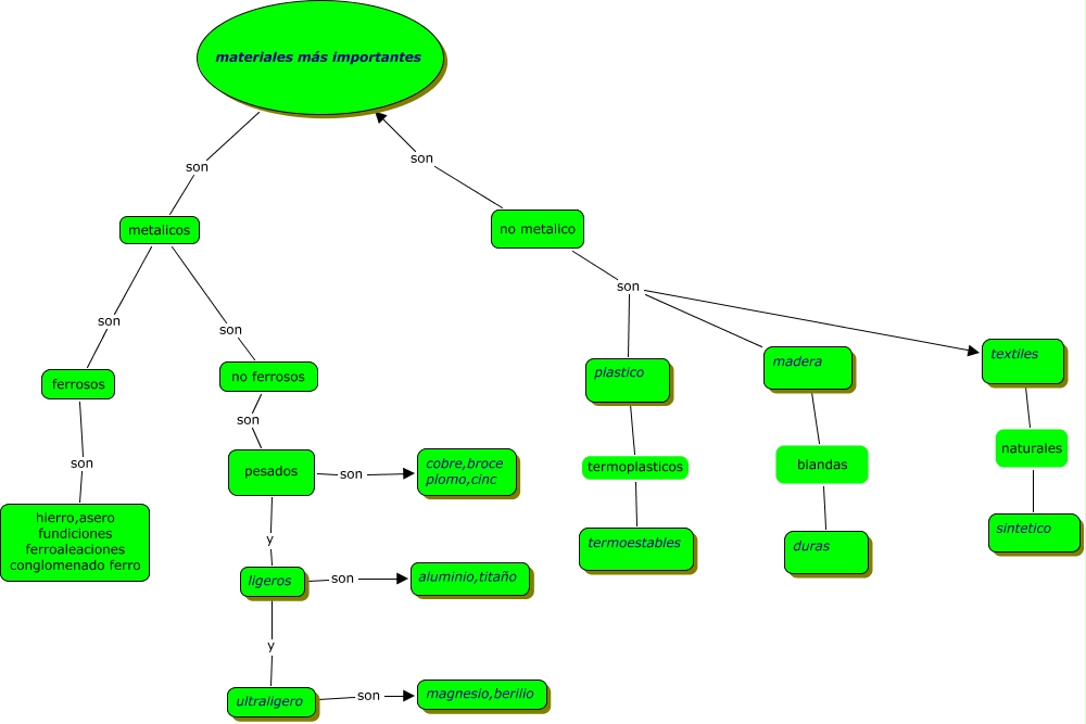 Este mapa conceptual tiene información relacionada a: miguel,juan, no metalico son plastico, no metalico son madera, plastico termoplasticos termoestables, metalicos son no ferrosos, materiales más importantes son metalicos, ligeros son aluminio,titaño, no ferrosos son pesados, no metalico son textiles, pesados son cobre,broce plomo,cinc, ferrosos son hierro,asero fundiciones ferroaleaciones conglomenado ferro