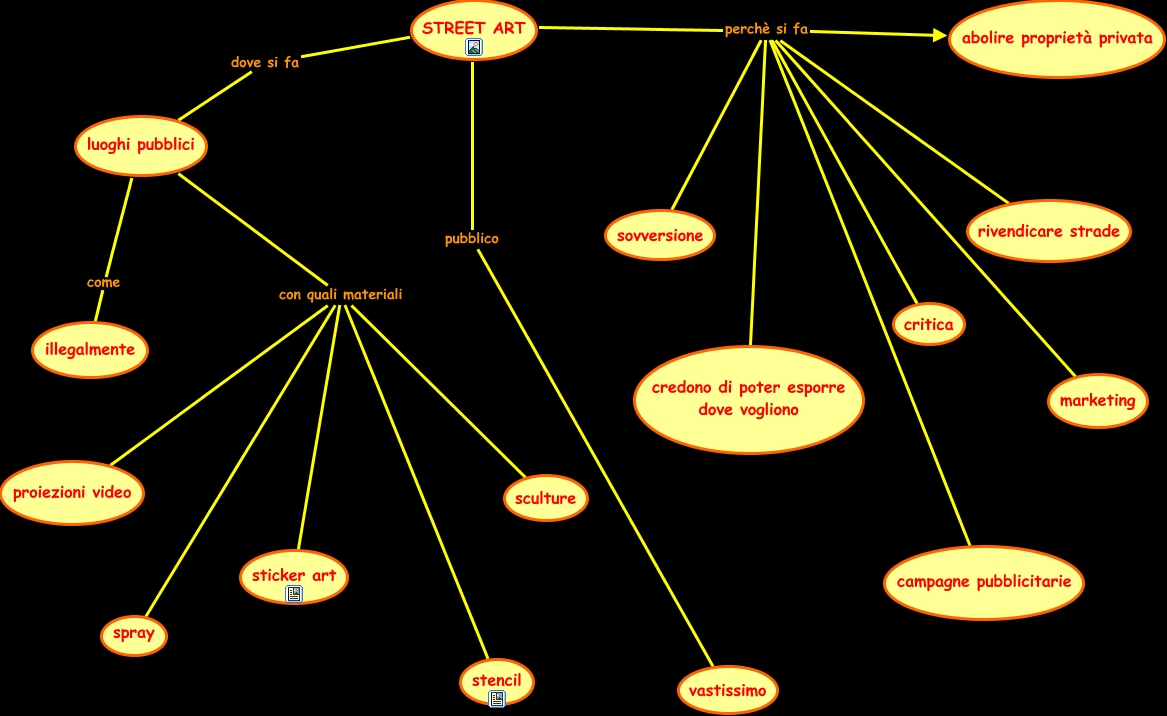 Questa Cmap, creata con IHMC CmapTools, contiene informazioni relative a: street art, STREET ART perchè si fa credono di poter esporre dove vogliono, luoghi pubblici con quali materiali proiezioni video, luoghi pubblici con quali materiali stencil, STREET ART pubblico vastissimo, STREET ART perchè si fa campagne pubblicitarie, STREET ART perchè si fa rivendicare strade, STREET ART dove si fa luoghi pubblici, STREET ART perchè si fa abolire proprietà privata, STREET ART perchè si fa marketing, luoghi pubblici con quali materiali spray, STREET ART perchè si fa critica, luoghi pubblici con quali materiali sculture, STREET ART perchè si fa sovversione, luoghi pubblici come illegalmente, luoghi pubblici con quali materiali sticker art