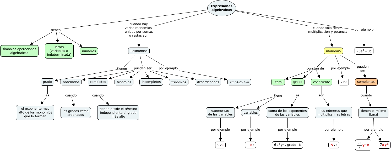 Este Cmap, tiene información relacionada con: Expresiones algebraicas3c, monomio pueden ser semejantes, Polinomios pueden ser incompletos, Polinomios por ejemplo <math xmlns="http://www.w3.org/1998/Math/MathML"> <mrow> <mtext> 7 </mtext> <mmultiscripts> <mtext> x </mtext> <none/> <mtext> 3 </mtext> </mmultiscripts> <mtext> +2 </mtext> <mmultiscripts> <mtext> x </mtext> <none/> <mtext> 4 </mtext> </mmultiscripts> <mtext> -4 </mtext> </mrow> </math>, Polinomios pueden ser binomios, exponentes de las variables por ejemplo <math xmlns="http://www.w3.org/1998/Math/MathML"> <mrow> <mtext> 5 </mtext> <mmultiscripts> <mtext> x </mtext> <none/> <mtext> 2 </mtext> </mmultiscripts> </mrow> </math>, suma de los exponentes de las variables por ejemplo <math xmlns="http://www.w3.org/1998/Math/MathML"> <mrow> <mtext> 6 </mtext> <mmultiscripts> <mtext> a </mtext> <none/> <mtext> 2 </mtext> </mmultiscripts> <mmultiscripts> <mtext> y </mtext> <none/> <mtext> 4 </mtext> </mmultiscripts> <mtext> , grado: 6 </mtext> </mrow> </math>, Polinomios tienen grado, coeficiente son los números que multiplican las letras, monomio constan de literal, tienen el mismo literal por ejemplo <math xmlns="http://www.w3.org/1998/Math/MathML"> <mrow> <mtext> 7x </mtext> <mmultiscripts> <mtext> y </mtext> <none/> <mtext> 2 </mtext> </mmultiscripts> </mrow> </math>, semejantes cuando tienen el mismo literal, monomio por ejemplo <math xmlns="http://www.w3.org/1998/Math/MathML"> <mrow> <mtext> 7 </mtext> <mmultiscripts> <mtext> x </mtext> <none/> <mtext> 2 </mtext> </mmultiscripts> </mrow> </math>, Expresiones algebraicas cuando sólo tienen multiplicacion y potencia monomio, Expresiones algebraicas tienen letras (variables o indeterminada), tienen el mismo literal por ejemplo <math xmlns="http://www.w3.org/1998/Math/MathML"> <mrow> <mfrac> <mtext> -3 </mtext> <mtext> 2 </mtext> </mfrac> <mmultiscripts> <mtext> y </mtext> <none/> <mtext> 2 </mtext> </mmultiscripts> <mtext> x </mtext> </mrow> </math>, literal tiene variables, monomio constan de grado, Polinomios pueden ser trinomios, grado es suma de los exponentes de las variables, Polinomios pueden ser ordenados