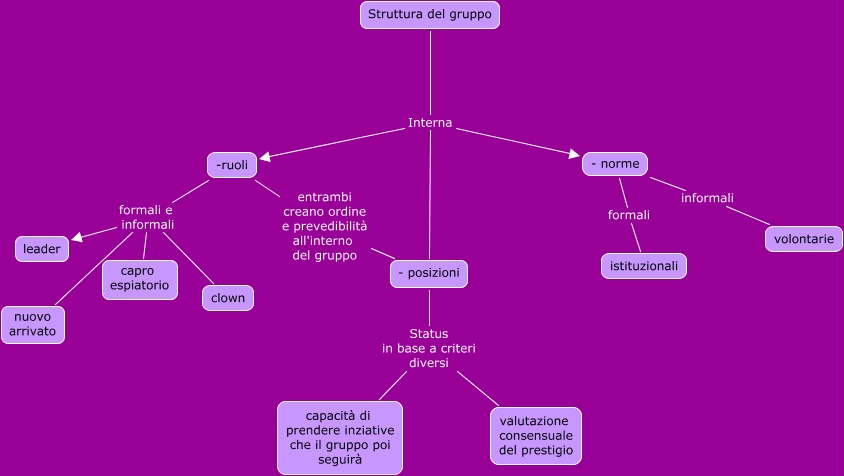 Questa Cmap, creata con IHMC CmapTools, contiene informazioni relative a: ruoil nel gruppo, -ruoli formali e informali nuovo arrivato, Struttura del gruppo Interna - norme, - norme formali istituzionali, -ruoli formali e informali clown, Struttura del gruppo Interna -ruoli, -ruoli entrambi creano ordine e prevedibilità all'interno del gruppo - posizioni, -ruoli formali e informali capro espiatorio, - posizioni Status in base a criteri diversi valutazione consensuale del prestigio, - posizioni Status in base a criteri diversi capacità di prendere inziative che il gruppo poi seguirà, Struttura del gruppo Interna - posizioni, -ruoli formali e informali leader, - norme informali volontarie