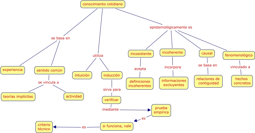 Este Cmap, tiene información relacionada con: conocimiento cotidiano, causal se basa en relaciones de contiguidad, conocimiento cotidiano epistemológicamente es fenomenológico, conocimiento cotidiano se basa en experiencia, si funciona, vale es criterio técnico, fenomenológico vinculado a hechos concretos, inducción sirve para verificar, conocimiento cotidiano epistemológicamente es incosistente, sentido común se vincula a teorías implícitas, verificar mediante prueba empírica, prueba empírica es si funciona, vale, conocimiento cotidiano se basa en sentido común, conocimiento cotidiano epistemológicamente es incoherente, conocimiento cotidiano utiliza inducción, conocimiento cotidiano epistemológicamente es causal, incoherente incorpora informaciones excluyentes, conocimiento cotidiano utiliza intuición, sentido común se vincula a actividad, incosistente acepta definiciones incoherentes