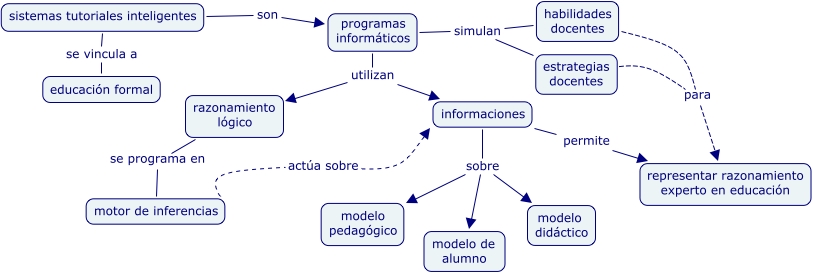 Este Cmap, tiene información relacionada con: ITS, programas informáticos utilizan razonamiento lógico, informaciones sobre modelo de alumno, informaciones sobre modelo pedagógico, programas informáticos simulan estrategias docentes, programas informáticos simulan habilidades docentes, estrategias docentes para representar razonamiento experto en educación, programas informáticos utilizan informaciones, informaciones sobre modelo didáctico, sistemas tutoriales inteligentes son programas informáticos, informaciones permite representar razonamiento experto en educación, razonamiento lógico se programa en motor de inferencias, motor de inferencias actúa sobre informaciones, sistemas tutoriales inteligentes se vincula a educación formal, habilidades docentes para representar razonamiento experto en educación